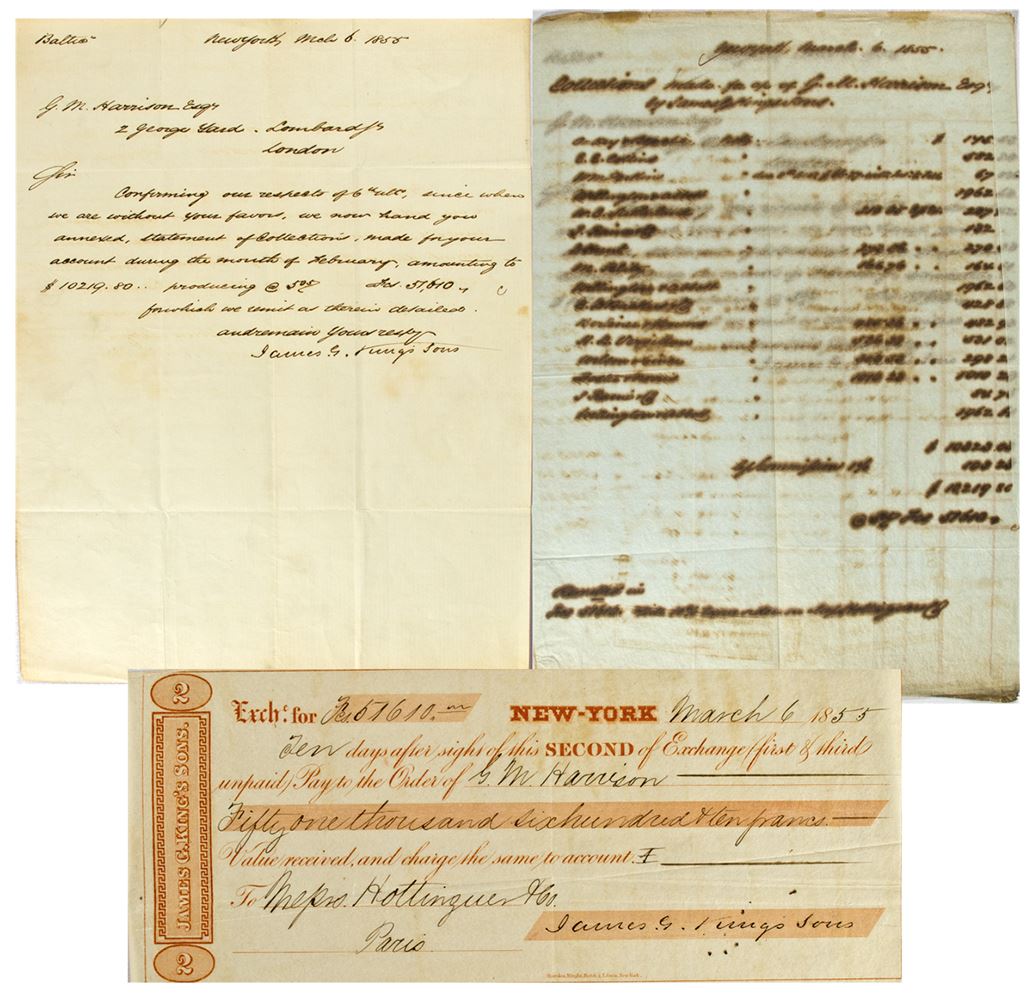 James Gore King was born in 1791 in New York City and died 1853 in New Jersey. A Congressman from 1849 to 1851, he founded King & Gracie, a banking firm in Liverpool, England. In 1824, he created the banking firm of Prime & Ward, New York City, which eventually became Prime, Ward & King. Thereafter he lived in New Jersey. His final banking firm was the House of James G. King & Son, from 1851 onward, which continued as James G. King’s Sons after his death. This collection of James G. King’s Sons' material contains: 1. A second of exchange made out to G. M. Harrison in the amount of 51, 6010 francs; 2. A letter to Harrison at 2 George Yard, Lombardy's London from James G. King’s Sons, New York, New York, and an onion paper copy of the same letter; 3. An onion copy of a list of collections made for Harrison by the firm. This man is not to be confused with James King of William.