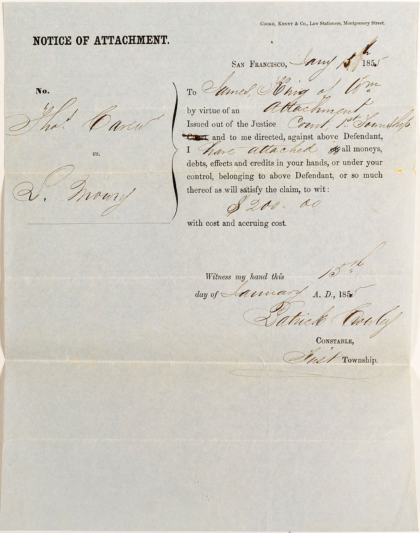 Thomas Carew (or Carey) vs. L. Mowry, to James King of William. The Constable of the first township issued the Notice of Attachment out of the Justice Court to attach "all moneys, debts, effects, and credits in your hands or under your control belonging to the above Defendant [James King of William] or so much thereof as will satisfy the claim, to wit: $200.00 with cost and accruing cost." On blue stock paper issued by Cooke, Kenny, & Co., Law Stationers, Montgomery Street. Very Good condition. James King of William (January 28, 1822 – May 20,1856) was a crusading San Francisco, California, newspaper editor whose shooting death in 1856 resulted in the establishment of the second San Francisco Vigilance Committee and changed the politics of the city. The Vigilance Committee hung the man who shot him, and King is given credit for rousting the criminal element from City government. King was among the first newspapermen to be honored by the California Journalism Hall of Fame.