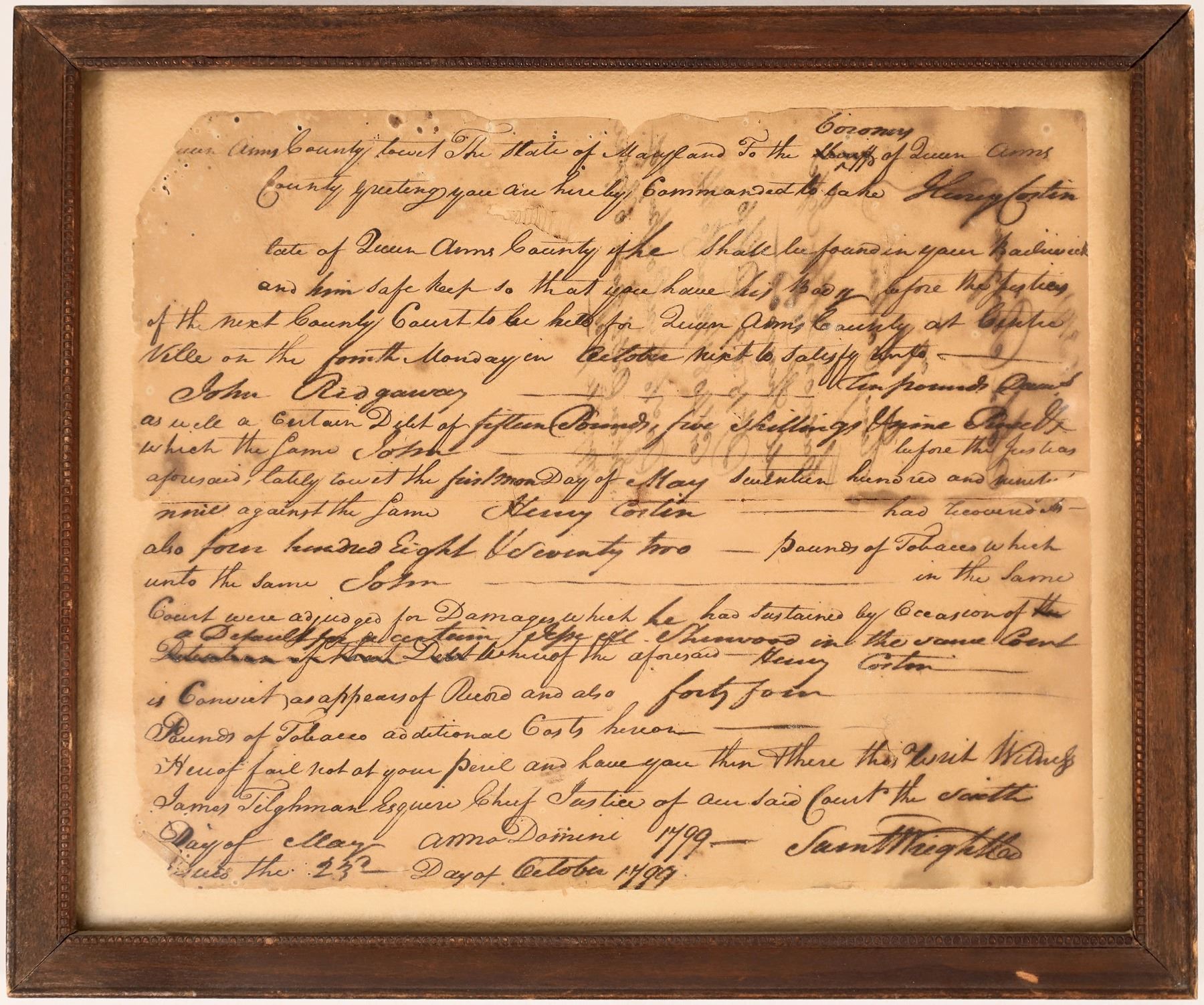 James Tilghman signed Capias at Satisfaction issuing out of the Court of Queens County, Maryland, May 6, 1799, directed to the Coroner of said County to have the body of one, Henry Cortin, at the next county court to satisfy John Redgaway, of a certain judgement of fifteen pounds, five shillings, and nine pence, which the plaintiff had recovered against the defendant, as also four hundred eight etc., pounds of tobacco sustained as damages. This is an ancient writ in which the debtor could be imprisoned until the debt was paid. Money was so scarce and unreliable in those days that tobacco was used in Maryland, Virginia and other states as its equivalent. The writ is addressed to the coroner on account of death or disability of the sheriff. " James Tilghman, a lawyer by profession, who after removing from Talbot to Chestertown, in Kent, thence removed to Philadelphia in the year 1762. He was well known to the profession in Pennsylvania, where be became secretary to the Proprietary Land office, which department of the government " by the accuracy of his mind and the steadiness of his purpose he brought into a system as much remarked for order and equity as, from its early defects, it threatened to be otherwise."1 He was one of the commissioner for the province of Pennsylvania, appointed by Governor Penn, for settling the boundary line between the colonies and the Indian territory, at the treaty held at Fort Stanwix in October and November 1758. He was also a member of the governor's council, and private secretary of Julianna, the widow of the late proprietary. In the dispute between the colonies and the mother country, he espoused the cause of the latter. The adoption of the principles of a loyalist involved the resignation of his public trusts and the loss of his private business, so that not long after the outbreak of hostilities he returned to Chestertown in Maryland, where he spent the remainder of his days. Such was his moderation and discretion, that, although his opinions were obnoxious, he enjoyed the respect of his fellow citizens, and received the considerate notice of Washington himself." from wikitree.com. Document 6.5x8". From the HYatt Estate. Maryland 1799
