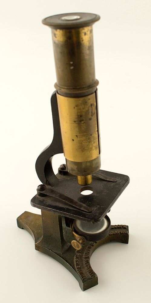 James W. Queen & Co., Philadelphia. Universal Household Microscope. Queen was a major supplier of miners lamps. Brass, 7 inches tall. The James W. Queen version of the 'Household' or 'Universal Household' microscope was made by the same French firm that made many other 'Household' microscopes. These microscopes are small instruments with a Lister limb, and a unique foot. The foot is roughly Y-shaped with the signature of: 'UNIVERSAL HOUSEHOLD MICROSCOPE, JAMES W. QUEEN &Co.' on the curved part of the foot. Date: 1885-1900 Location: Philadelphia, Pennsylvania HWAC# 35462