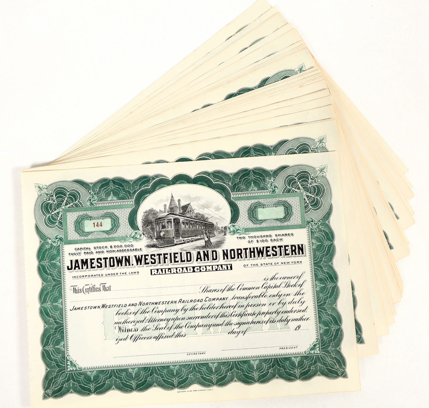 Group of approx. 28 unissued stock certificates from the Jamestown, Westfield and Northwestern Railroad Company, all dated 19XX. All uncancelled. Nice vignette of a tram. 11.5"x8.5" certs, all in excellent condition; see photos.
