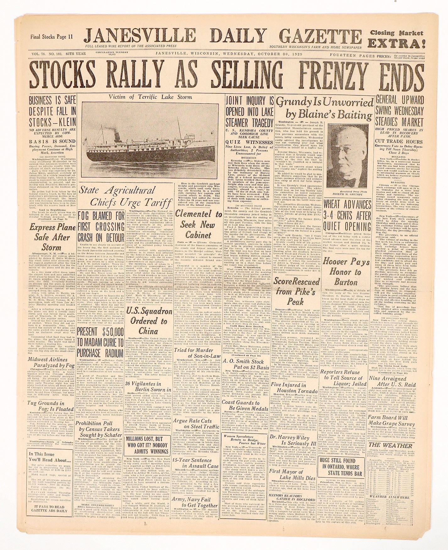 Oct 30, 1929 issue with next day coverage of the Oct 29, 1929 crash of the NY Stock Exchange, marking the beginning of the Great Depression. "Stocks Rally as Selling Frenzy Ends" "The Wall Street crash of 1929, also known as the Great Crash, was a major stock market crash in the United States which began in late October 1929 with a sharp decline in prices on the New York Stock Exchange (NYSE) and ended in mid-November. The crash began a rapid erosion of confidence in the U.S. banking system and marked the beginning of the worldwide Great Depression, which lasted until 1939; it is thus considered the most devastating in the country's history. It is most associated with October 24, 1929, known as "Black Thursday", when a record 12.9 million shares were traded on the NYSE in a single day (as compared to an average of four million), and October 29, 1929, known as "Black Tuesday", when about 16.4 million shares were traded." from Wikipedia.