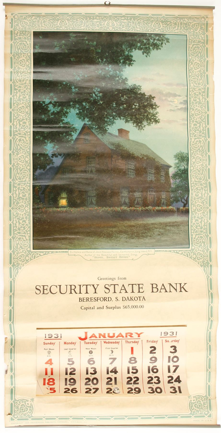 Security State Bank wall calendar, January 1931. Approx 24x14"