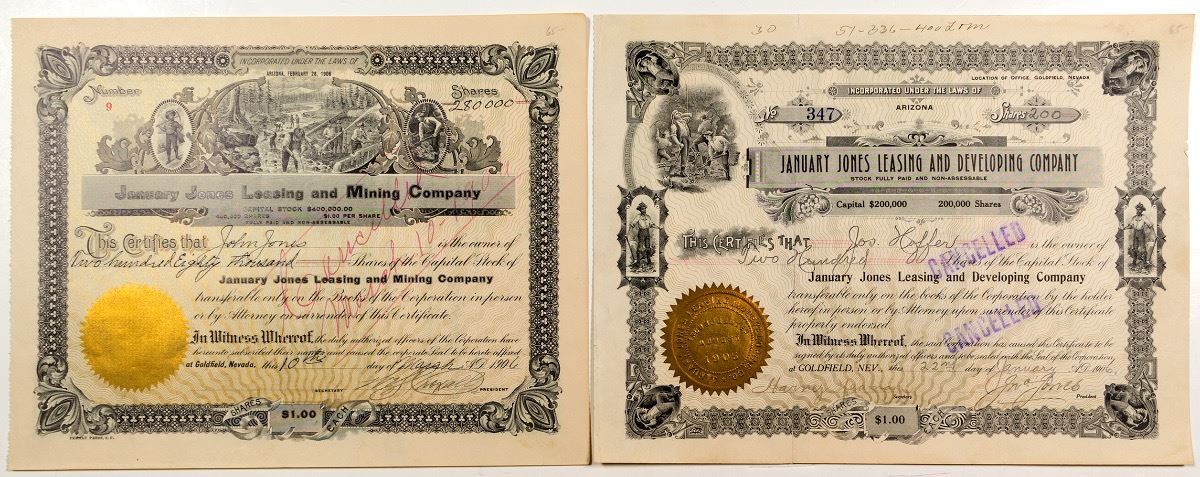 January Jones Mining Stock Certificates w/ Jones Signature & Huge Transfer of Shares