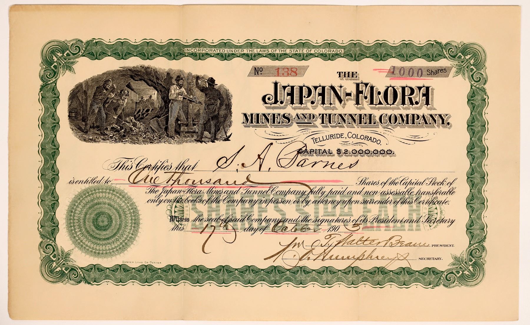 #138 for 1000 shares to SA Barnes. Signed by president Walter Beane and secretary Humphreys. Nice underground mining vignette. Dated October 17, 1903. Incorporated on Aug. 22, 1903, in Colorado. Rip at bottom right fold. Overall nice. Property: 43 patented claims, 311 acres, and a 5-acre mill-site at Pandora, in the Upper San Miguel district, 4 miles from railway. Property shows 5 fissure veins. (Engineering and Mining Journal, 21 July 1906, 4 August 1906).