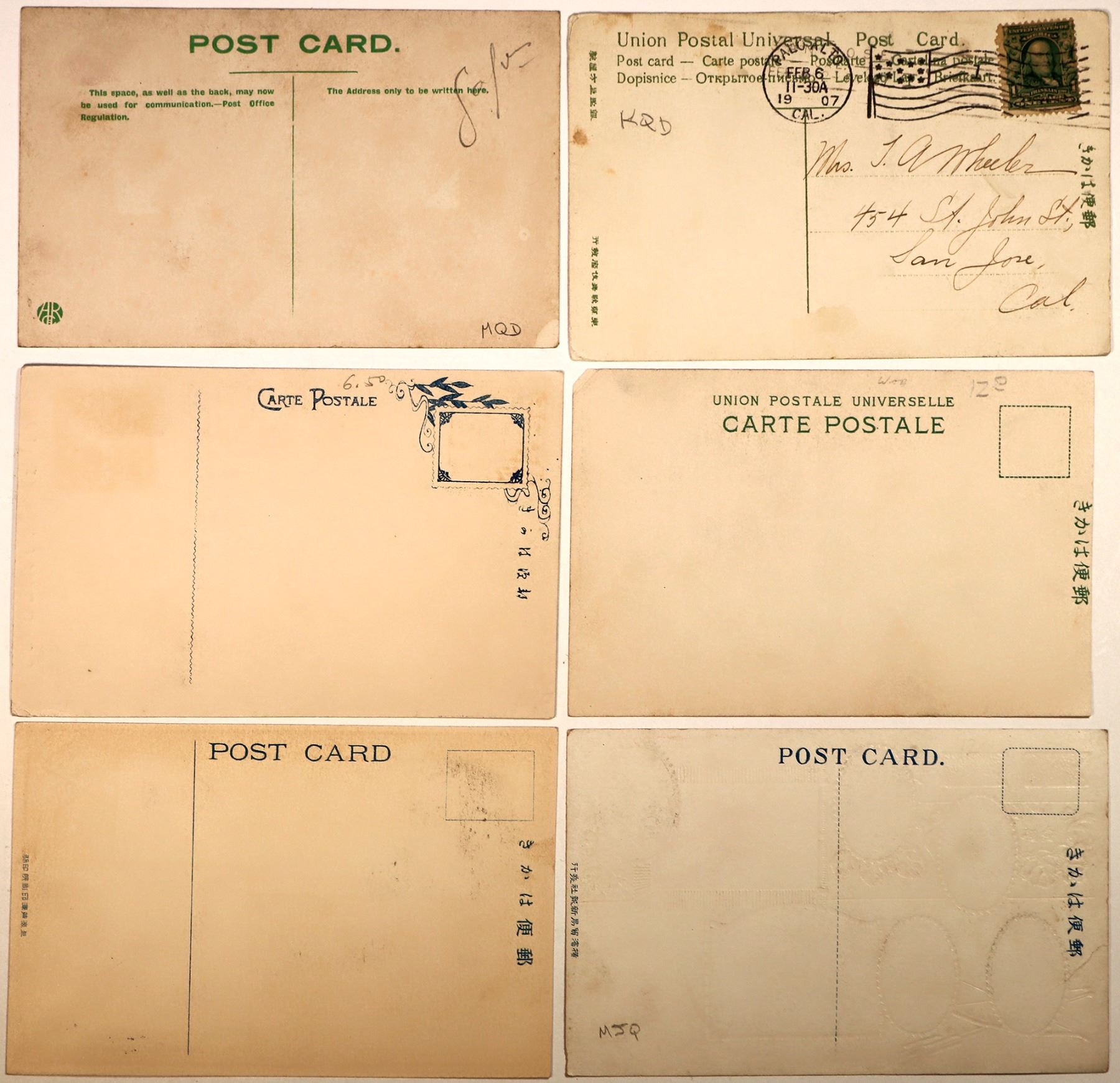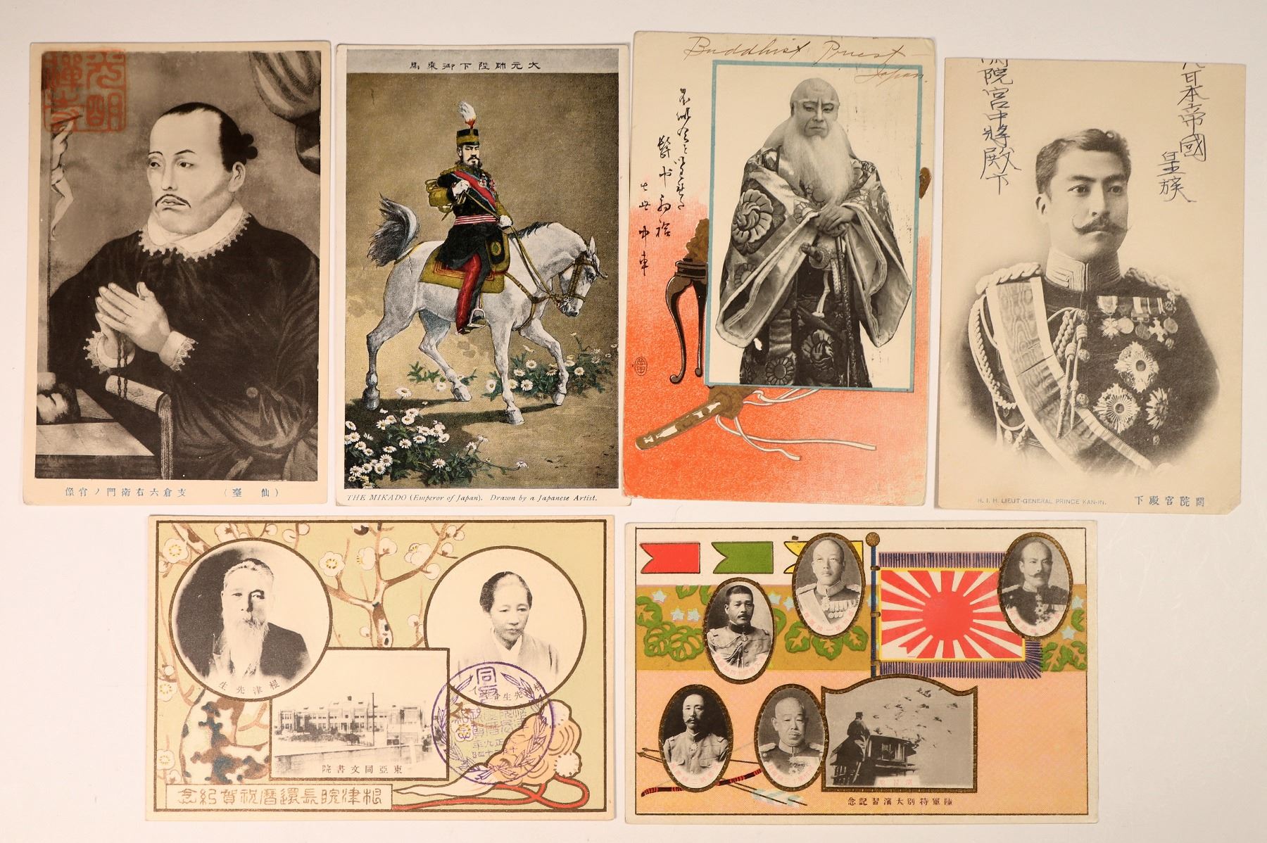 A collection of 6 postcards of Japanese Royalty, circa early 1900s. Colorful, mostly RPCs, all in Japanese language, with 1 stamped with seal on front, another postmarked Palo Alto, Cal. 1907.[ Japan