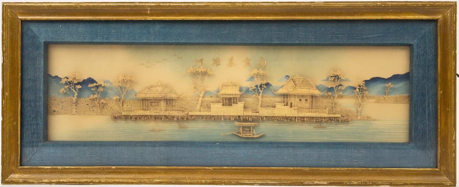 Hand carved wood (balsa?) scene of Japanese structures next to body of water w/boat in foreground. Water & sky/mountain backdrop painted in. Mounted & framed under glass. Fantastic intricate design of trees, land, buildings & boat w/oarsman. No glass imperfections. Some wearing on wooden frame but no chips or cracks. Dimensions: (frame) 23 1/2" x 9 1/2"; (image) 18 7/8" x 5".[ Japan