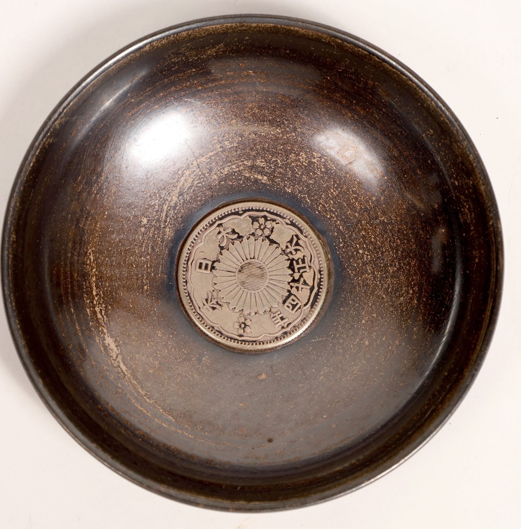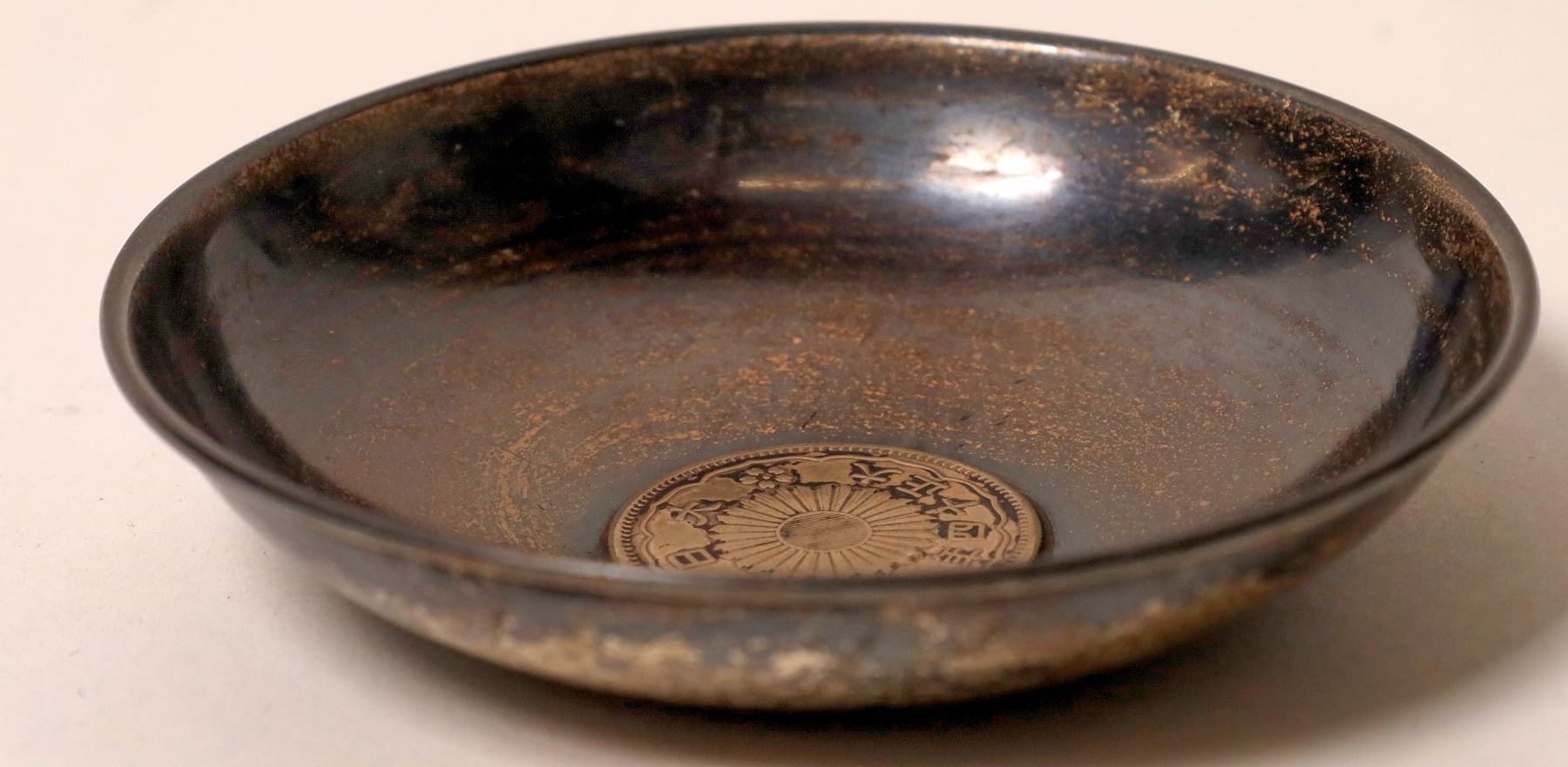 Metal bowl 76 mm wide and 15 mm deep with Japanese silver coin at center. 1.13 ounces.
