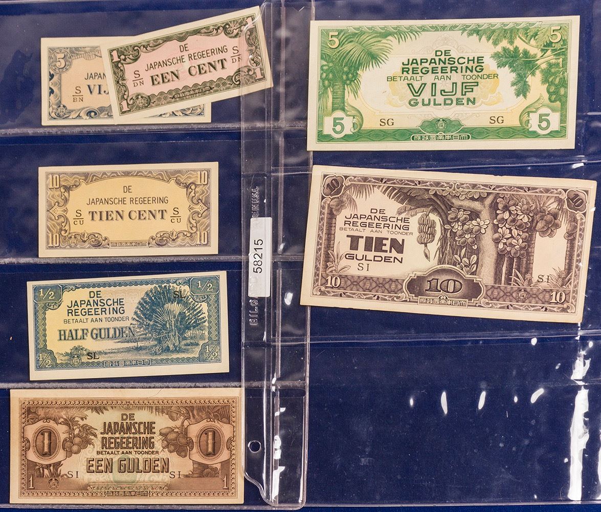 Japanese Invasion currency from the Dutch East Indies. This froup contains 1c,, 5c, 10c, 1/2 gulden, 1 gulden,5 and 10 gulden notes in Au to unc. . Date: Location: zJapan HWAC# 58215