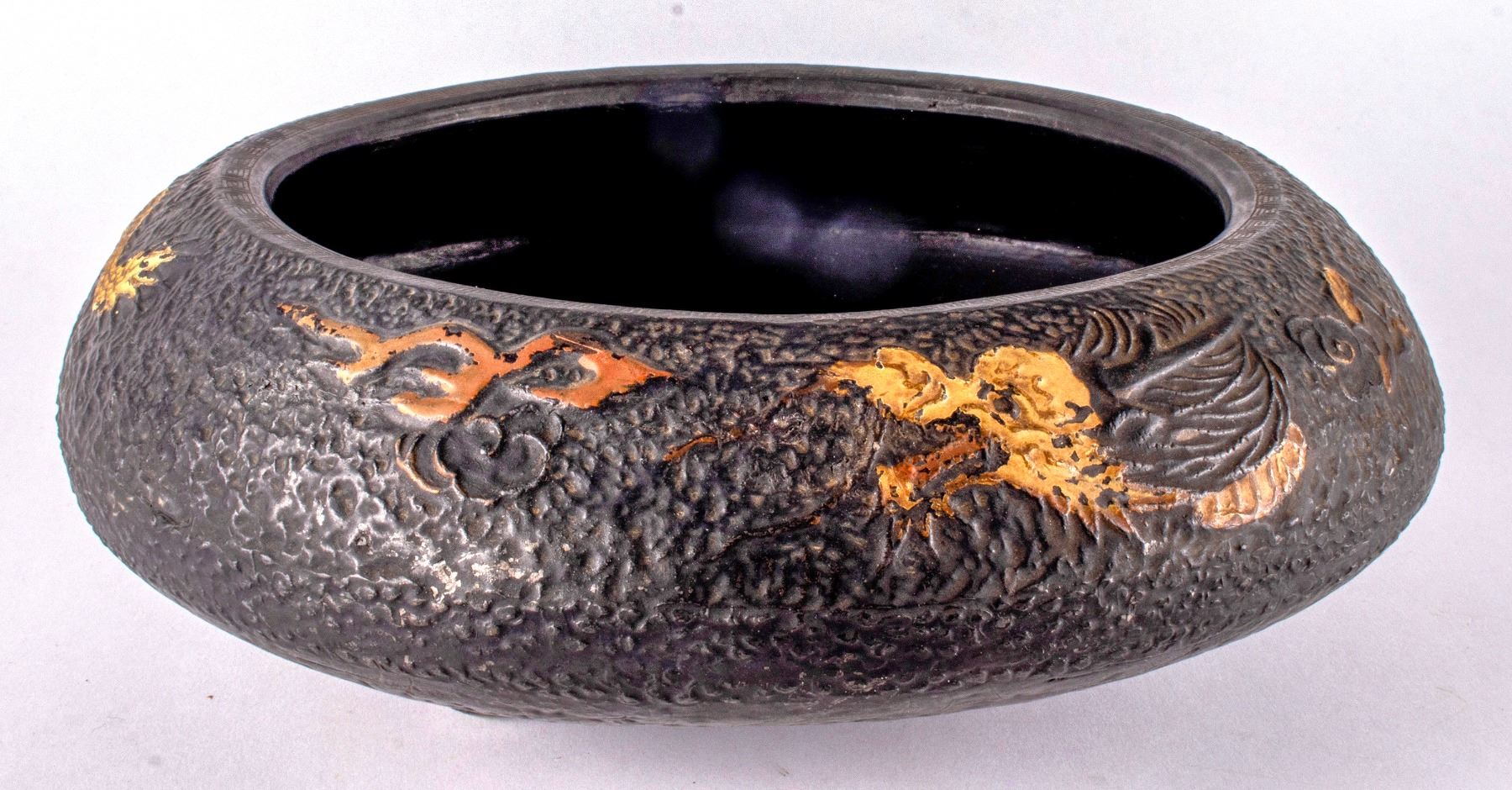 Black round Japanese decorative bowl with gold colored highlights. 3 molded feet. 3.5x10", bowl interior has some wear.