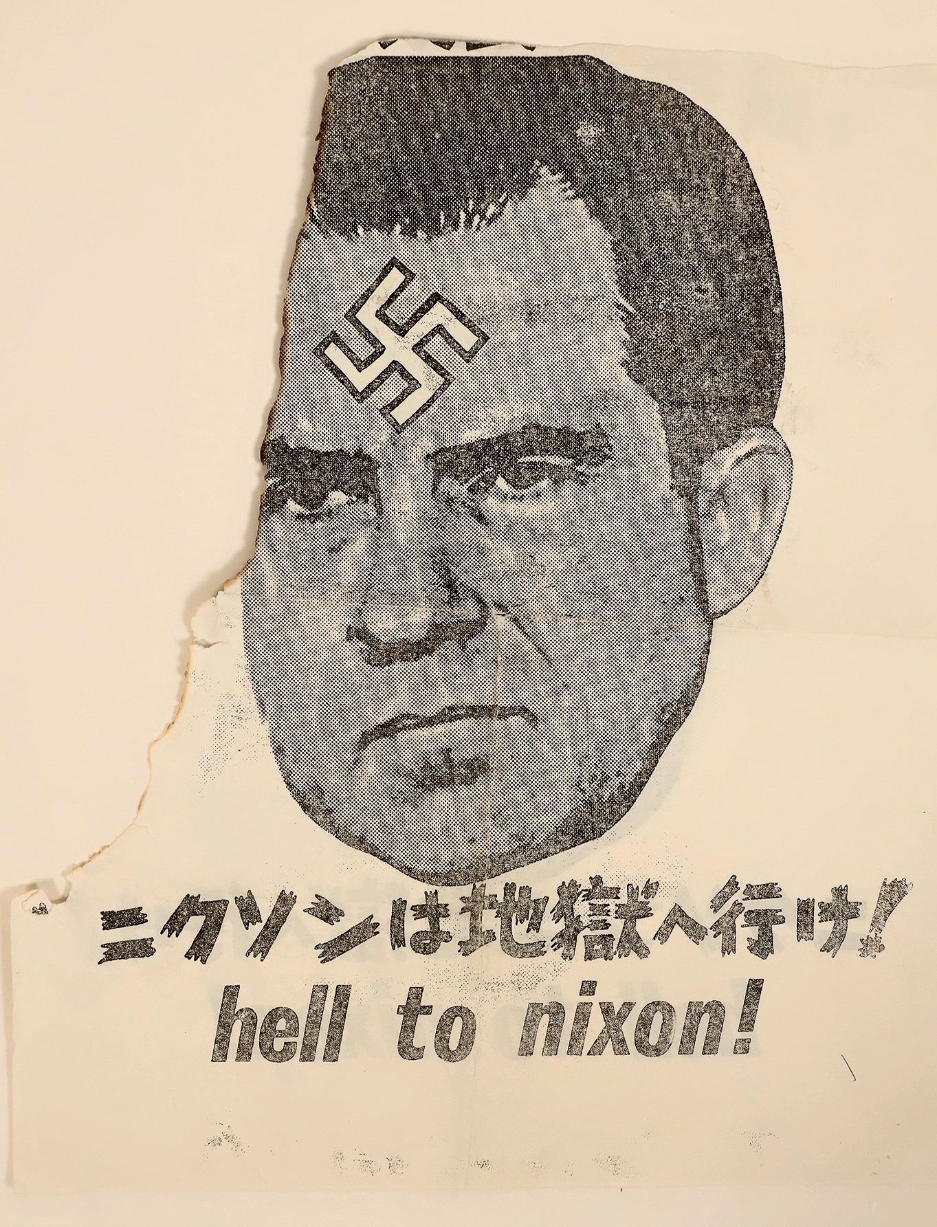Richard M. Nixon hate propaganda printed by a Japanese faction. During his vice presidency and as president Nixon ran hot and cold with his relationships in Asia, including China and the war in Vietnam. As vice president, he was sent to Asia to look at Japan's reconstruction after the war and later, as president, he was embroiled in controversy. This is a rare leaflet 10"x 12", but has a large portion ripped from an upper corner, but that face is still looking at you, complete with swastika on his forehead. Please see photos for more details.