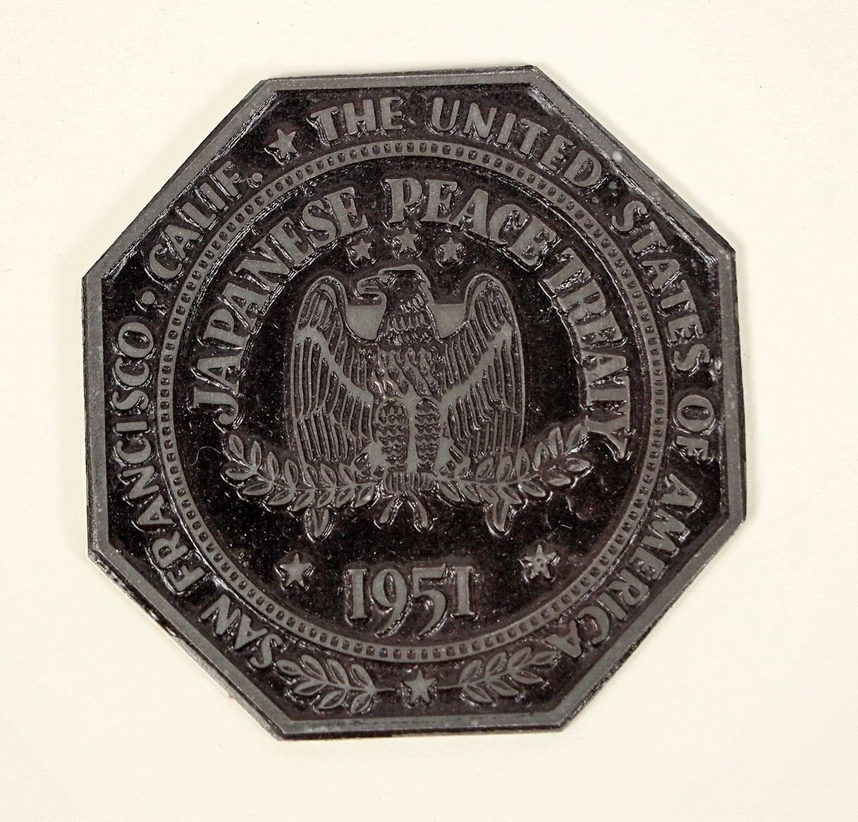 Octagonal medal (45 mm) mounted on cardboard with a traditional Japanese decorative element on the left side. Medal reads: San Francisco Calif. / The United States of America / Japanese Peace Treaty / 1951. The Treaty of San Francisco was signed by 49 nations on September 8, 1951 at the War Memorial Opera House in San Francisco. It formally ended the legal state of war and re-established peaceful relations between Japan and the Allied Powers.