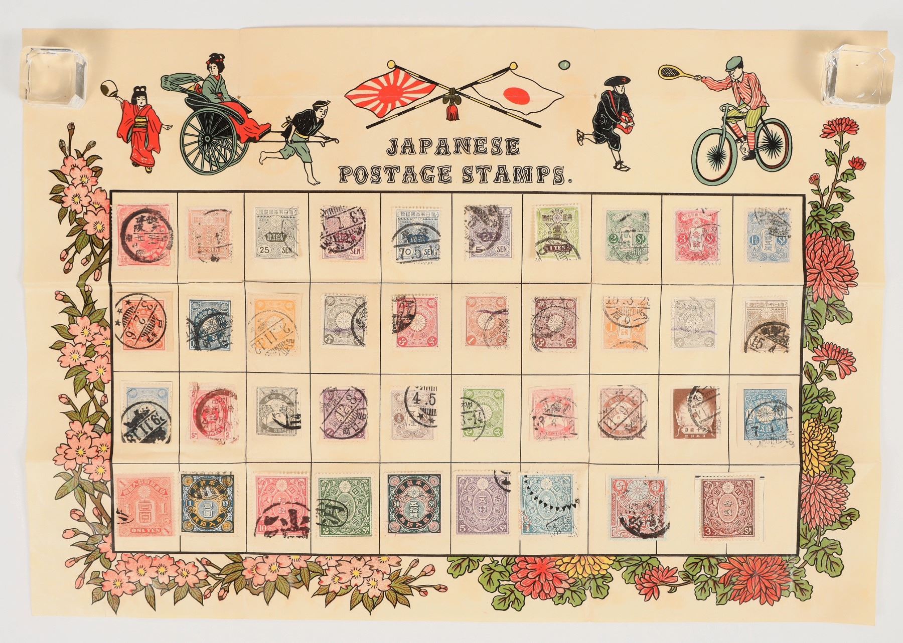 Cute wax paper sheet labelled Japanese Postage Stamps that has 40 stamps (4 rows of 10). Japanese vignettes. 10.5 x 15"