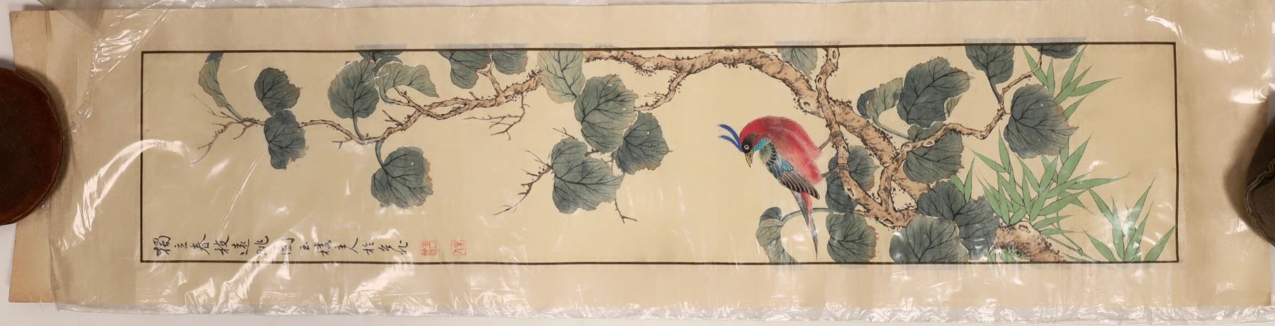 Beautiful red bird in a tree on this 8 x 32 inch print with Asian characters along the upper left side. Worthy of research.