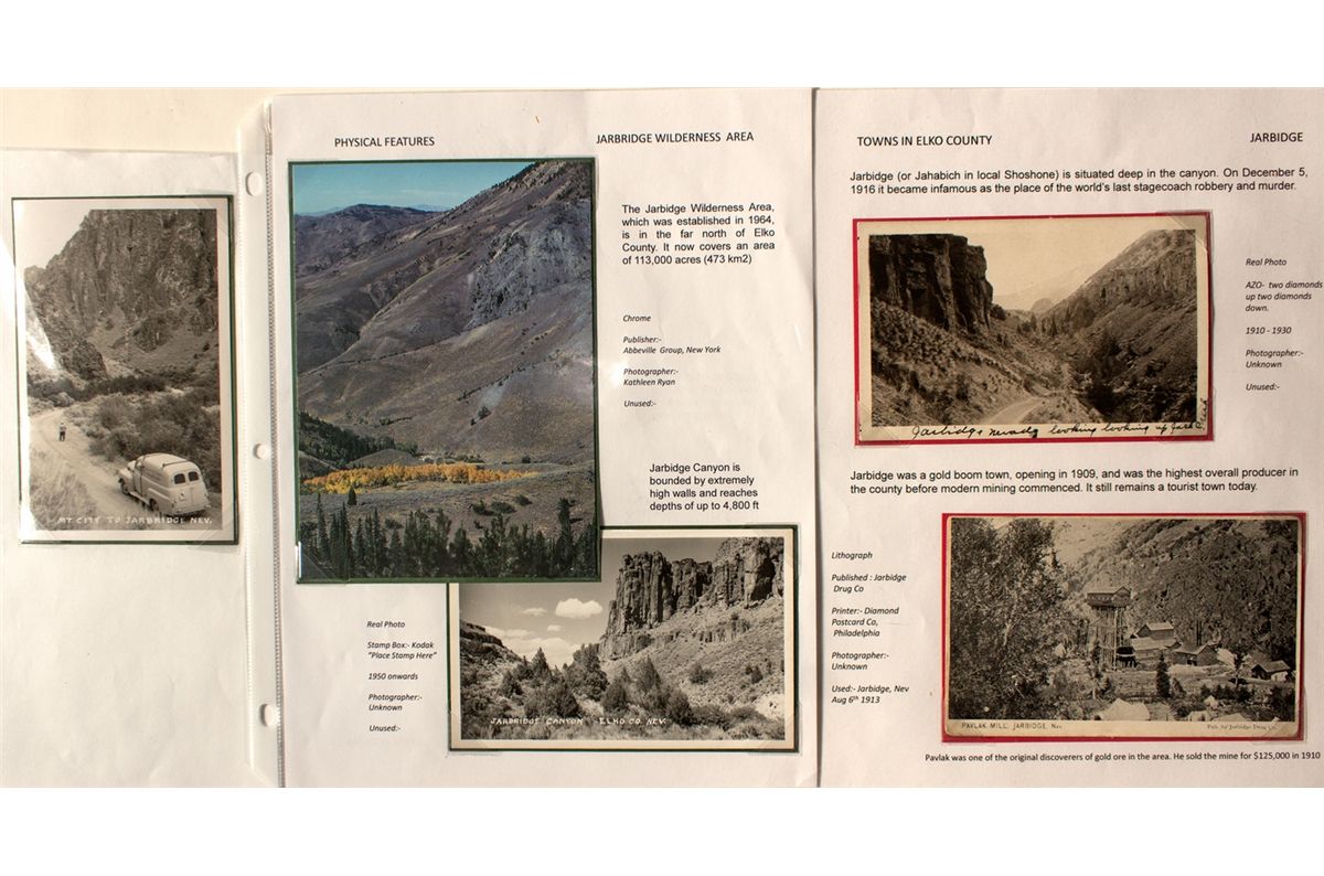 Lot of five. Three RPC's. 1) Handwritten "Jarbidge Nevada looking up Jack Creek. 2) Pavlak Mill. Cancelled Jarbidge, August 6, 1913. 3) Oversize Jarbidge Wilderness arial. Photographer Kathleen Ryan. 4) RPC Jarbidge Canyon, 5) Interesting photo of the postal van on the dirt road from Mountain City to Jarbidge. (Rhodes collection)