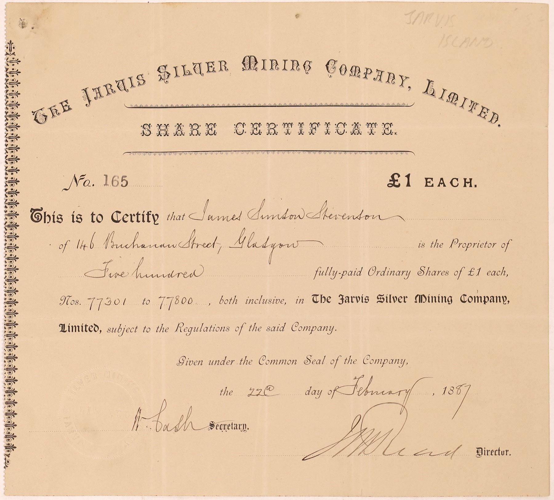 A director's report in June of 1887 reported that the mine had begun in 1886, closed for a while and is now back in operation. Although they have not made a great discovery, rich silver found from time to time portends good things. This is an English company. #165 for one pound to James Snowden Stevenson of Glasgow. Dated Feb. 22, 1887. Cut unevenly on left, but not corner, edge of discoloration issues. The company was out of business by 1917. There is a Jarvis Island off the coast near Bamfield?