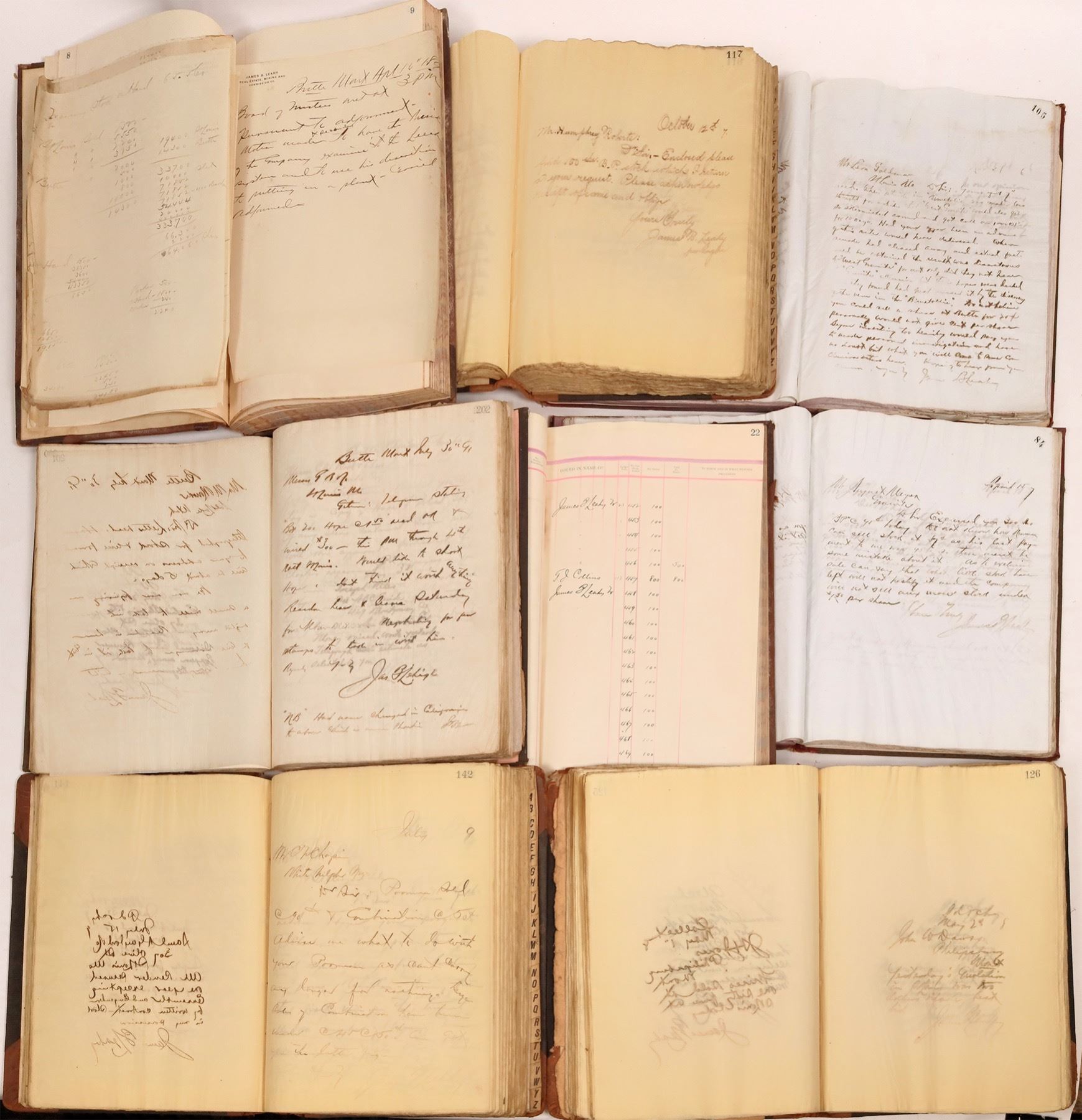 A major archive of five letterpress books and two business ledgers from James B. Leahy of Butte (City), 1886-1893. Leahy was sole proprietor of the Real Estate Mining and Commission Company. From his newspaper advertisements in the Butte papers, it appears Leahy was one of the key mining stock promoters in the region. Leahy was the key promoter for such key mines as the Original Butte, Moulton, Alice, Black Pine, Flint Creek, Montana Fire Clay, Granite Mountain, West Granite, Tuscarora (in Argenta, Beaverhead Co.). His business was so successful that he opened office in the summer of 1890 in Spokane and Boise.