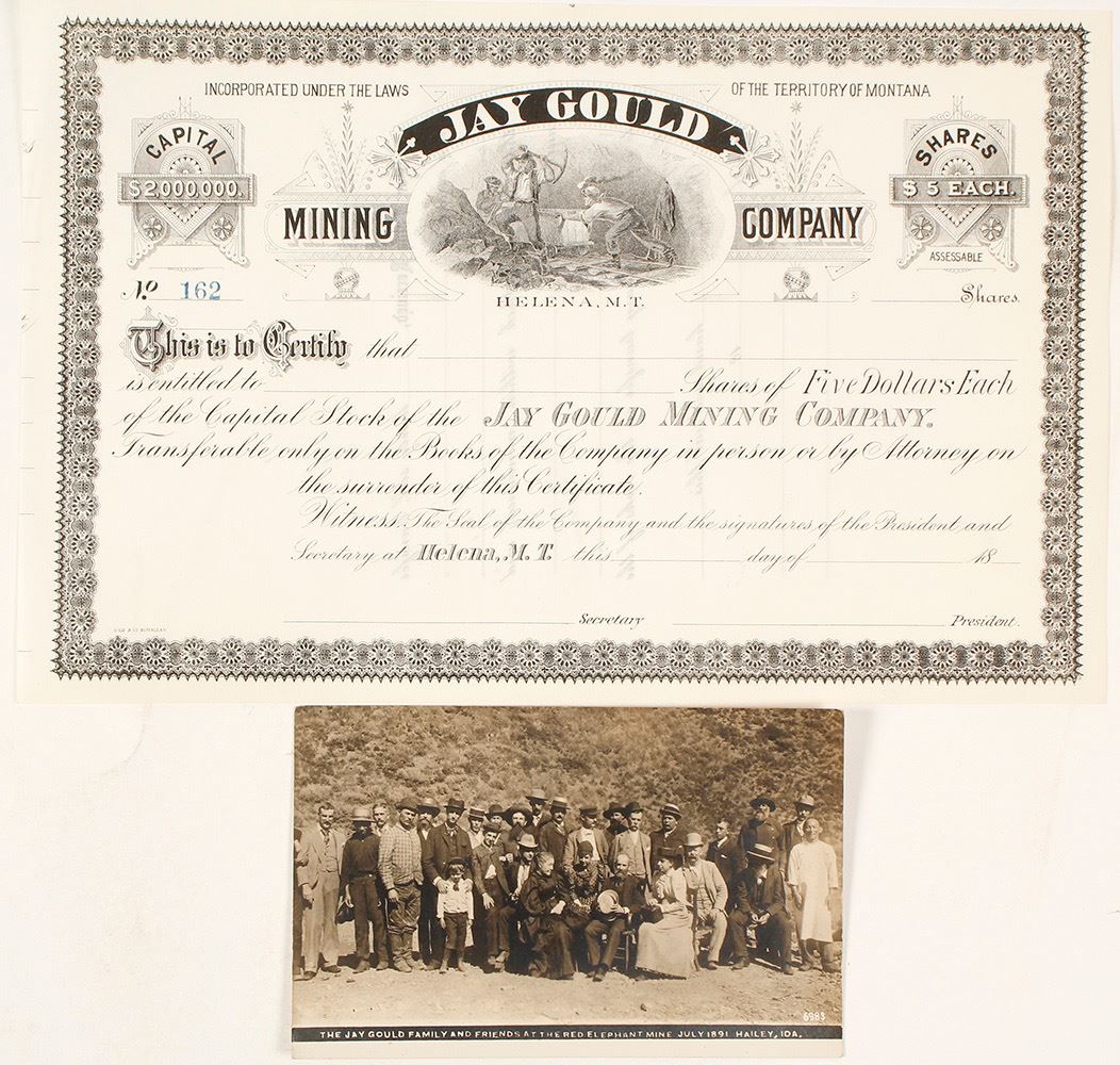 Great pairing. 1) Choice unissued Jay Gould Mining Company, Helena, M.T., stock certificate. Nice underground mining vignette. 18--. 2) Rare real photo postcard. Title at bottom: "The Jay Gould Family and Friends at the Red Elephant Mine, July 1891, Hailey, Ida." No photographer listed. 27 people present in the photo. Not mailed. Jay Gould is perhaps most known for being a railroad titan, also referred to as a "robber baron of the Gilded Age." (Al Adams Gold Rush Memorabilia Collection) Date: Location: Helena, Montana HWAC# 58560