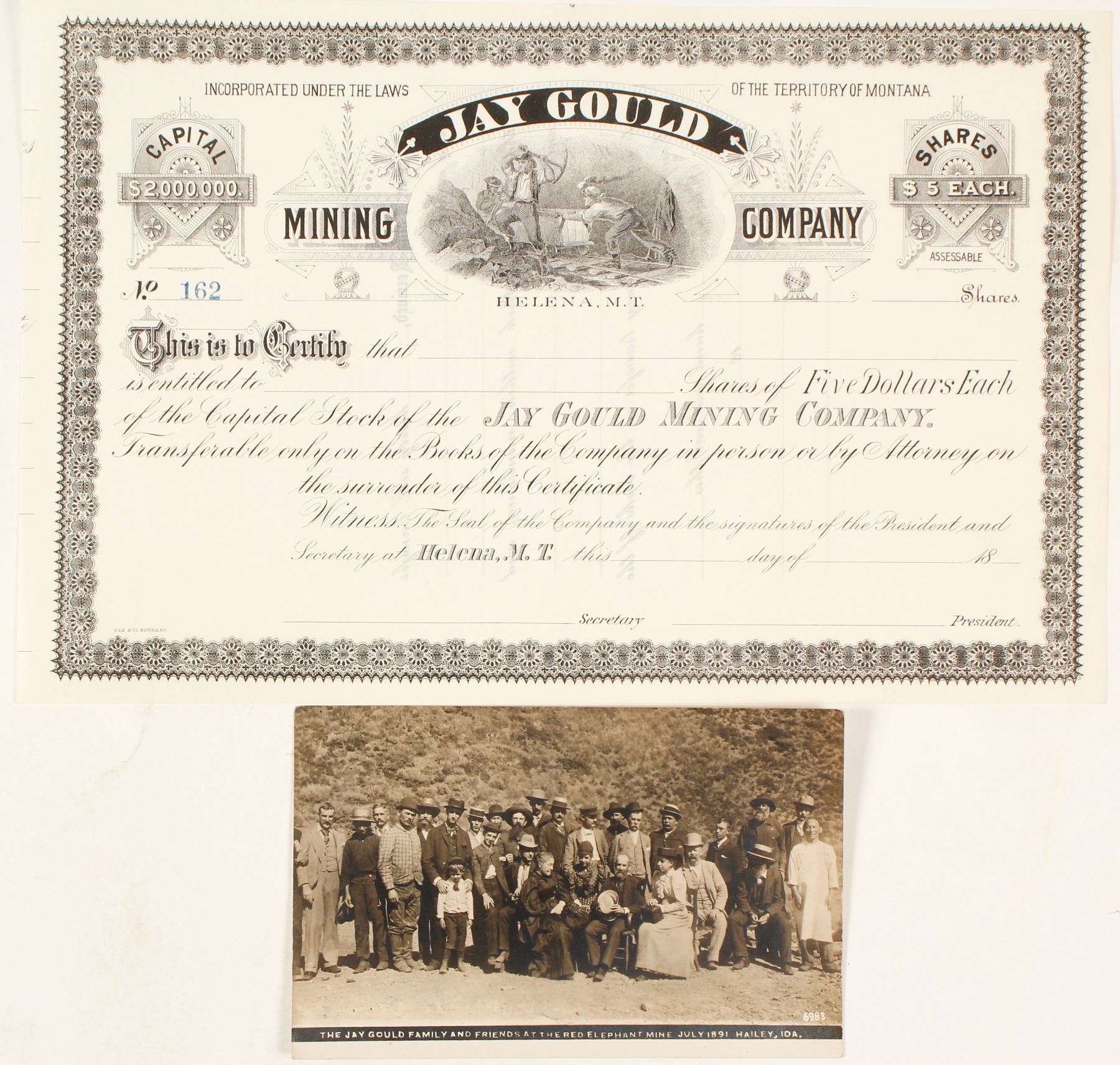 Great pairing. 1) Choice unissued Jay Gould Mining Company, Helena, M.T., stock certificate. Nice underground mining vignette. 18--. 2) Rare real photo postcard. Title at bottom: "The Jay Gould Family and Friends at the Red Elephant Mine, July 1891, Hailey, Ida." No photographer listed. 27 people present in the photo. Not mailed. Jay Gould is perhaps most known for being a railroad titan, also referred to as a "robber baron of the Gilded Age." State: Montana City: Helena Al Adams Collection. HWAC# 58560