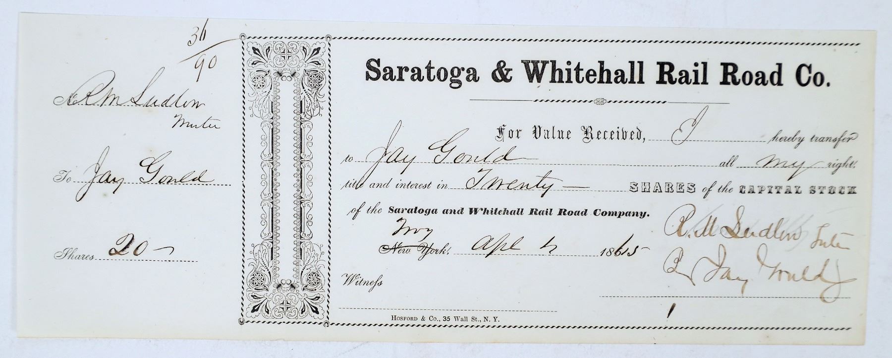R. M. Sudlow transferring 20 shares of the Saratoga and Whitehall Rail Road Company to Jay Gould, April, 1865. Certificate is 10 1/2 x 4 inches; lithography by Hosford & Co., 35 Wall St., New York.