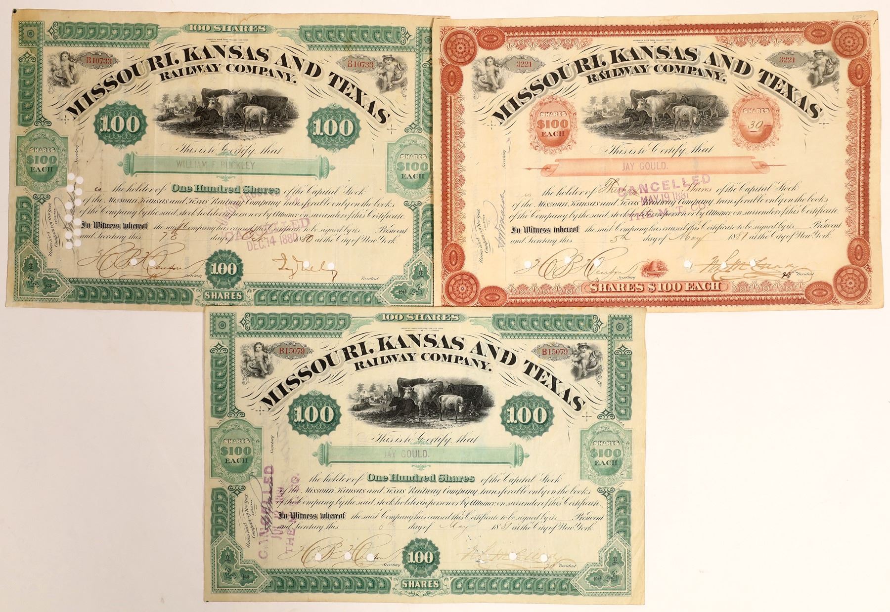 Three different certificates all signed by Jay Gould in one form or another. 1) First one is a green 100 share Missouri Kansas and Texas railway issued to Jay Gould on May 6, 1881. The signature of Pres. is obscured though it is not Gould. On the reverse is a clear blue signature of Jay Gould at bottom right. Hole cancels through signatures. 2) The second certificate is a brown hundred share Missouri Kansas and Texas certificate also issued to Jay Gould, not signed by him as president, May 5, 1881. Signed by Jay Gould on the reverse. 3) The third certificate is issued to William Buckley, signed by Jay Gould as president on October 7, 1880. Not signed by him on the reverse. WAS at signature, Jay Gould still bold and easily readable. This is a nice trio different from the rest of the collection.