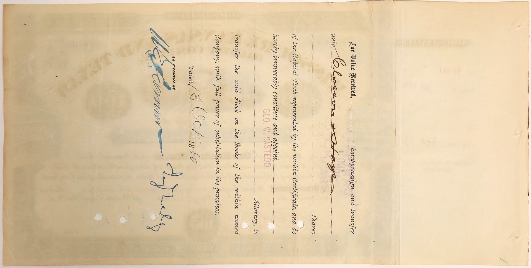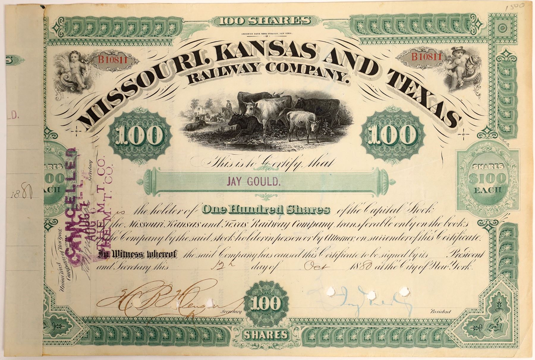 Issued to Gould and signed by president Gould. Gould also signs on reverse. #B10814 for 100 shares. Cattle vignette. Light edge discoloration and dog ear lower right. Over all nice. Hole punch cancelled. The Missouri, Kansas & Texas Railway was incorporated in May 1870 in Junction City, Kansas. The company received government land grants to build a supply railroad connecting the frontier military bases of Fort Riley, Fort Gibson, and Fort Scott; and eventually Fort Worth, as well as establishing connections with other railroads that served Fort Leavenworth and Fort Smith — but its broader ambitions were to connect Chicago and New Orleans. Gould gained ownership just about the time this certificate was issued! J Gould was an American railroad magnate and financial speculator who is generally identified as one of the Robber barons of the Gilded Age. His sharp and often unscrupulous business practices made him one of the wealthiest men of the late nineteenth century. Gould was an unpopular figure during his life and remains controversial.