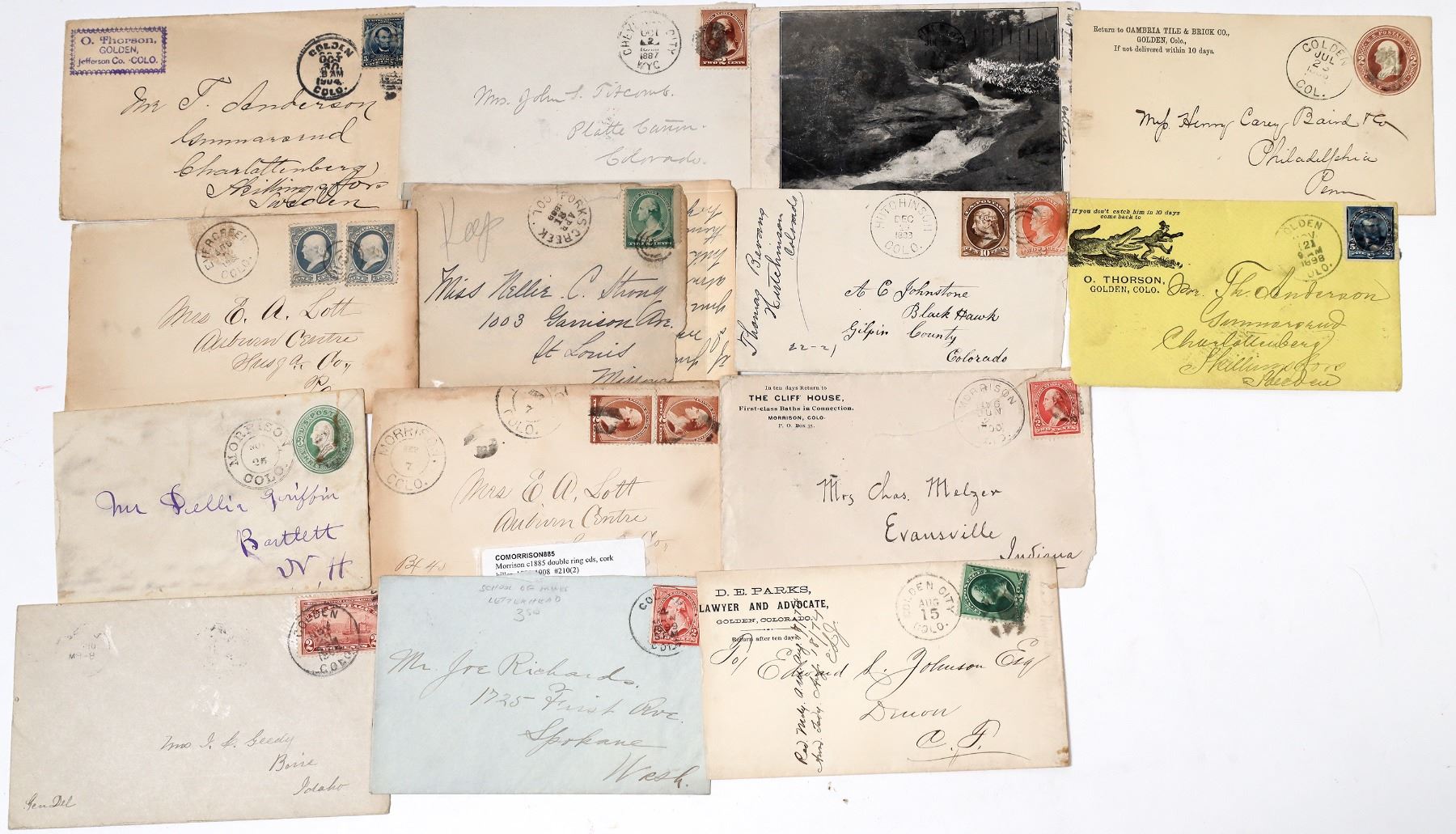 Lot of 14. 1) Golden. Six covers: O. Thorson cc, 1898 pictorial and 1904; Cambria Tile & Brick Co. cc, 1880s; DE Parks, Lawyer, cc, 1874, to Denver, C.T.; and 1899 and 1909 covers. 2) Morrison. Three covers: The Cliff House cc, 1900; c.1885 double ring with cork killer; and 1881 with double ring. 3) Others: Evergreen, 1880s; Hutchinson, 1882 with 12 cents of postage; Forks Creek 1889 cover with multi-page personal letter; post card with Pine 1907 cancel; and cover with 1887 Cheyenne City cancel to Platte Canon, Colorado.