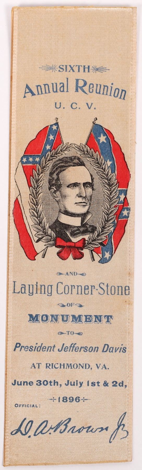 1896 Sixth Annual Reunion, UCV, Laughing Corner Stone of Monument to President Jefferson Davis at Richmond, VA, 1896. Nice condition with bold red and blue,7.75x2".