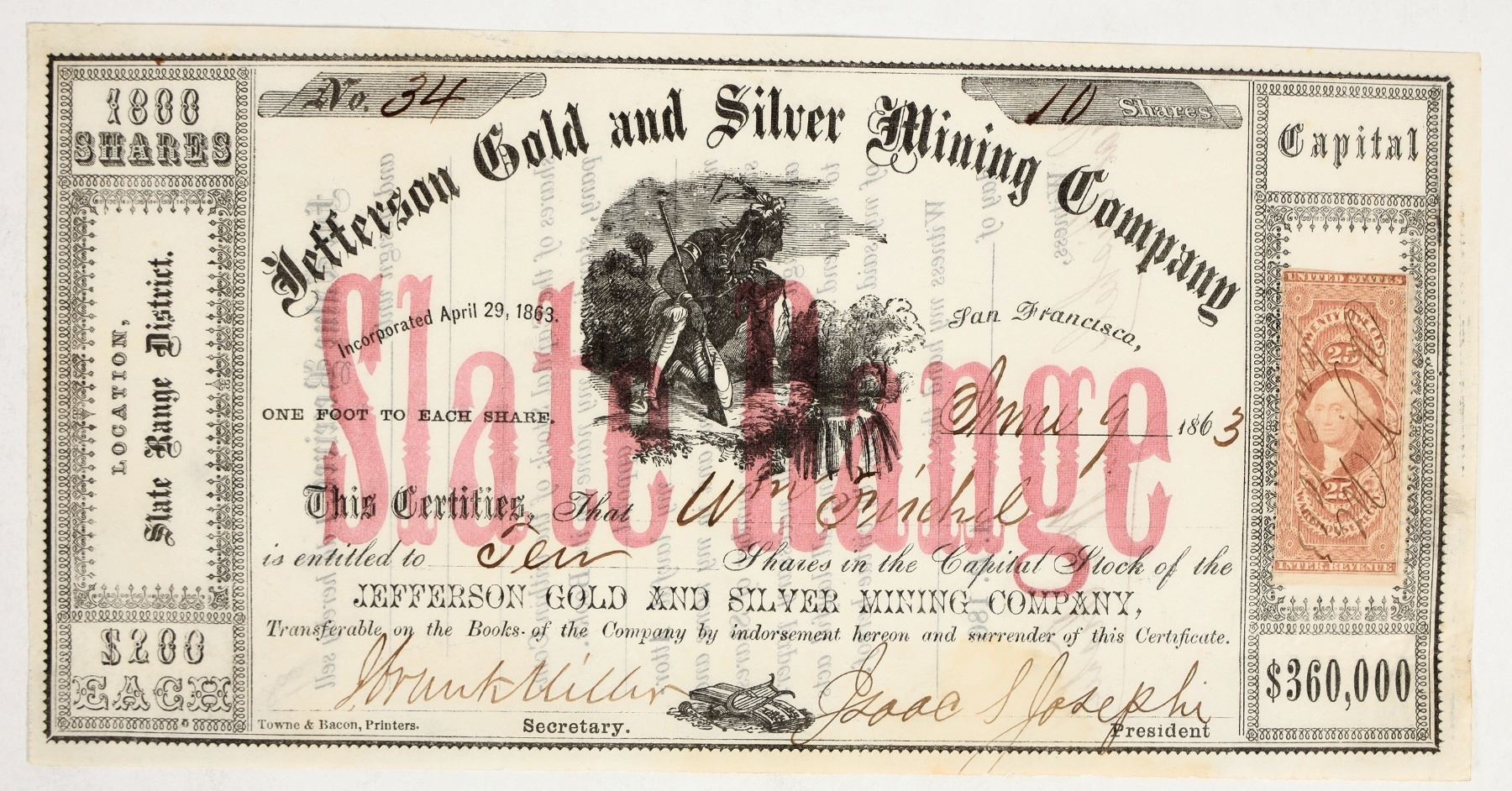 I/U. Incorp. 1863. Jefferson Gold And Silver Mining Co. Stock, issued 1863, 25c revenue stamp on right side. Located in the Slate Range District of Inyo County. Each share is equal to one foot. Towne & Bacon printers. Excellent cond. Works in the Slate Range District in eastern Tulare County, later to become Inyo County. [American Revenuer, January-February 2006, article by Mahler]