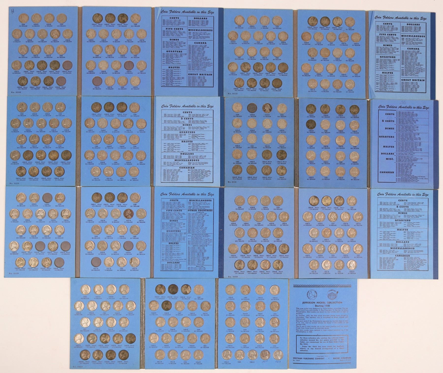 Lot of seven Whitman #9009 blue albums: three complete 1938-1961-D, 65 coins in each; one complete through 1960, 63 coins; one with 60 coins, missing only 5; one with 59 coins, missing only the 1938-S. All coins EF-AU condition.