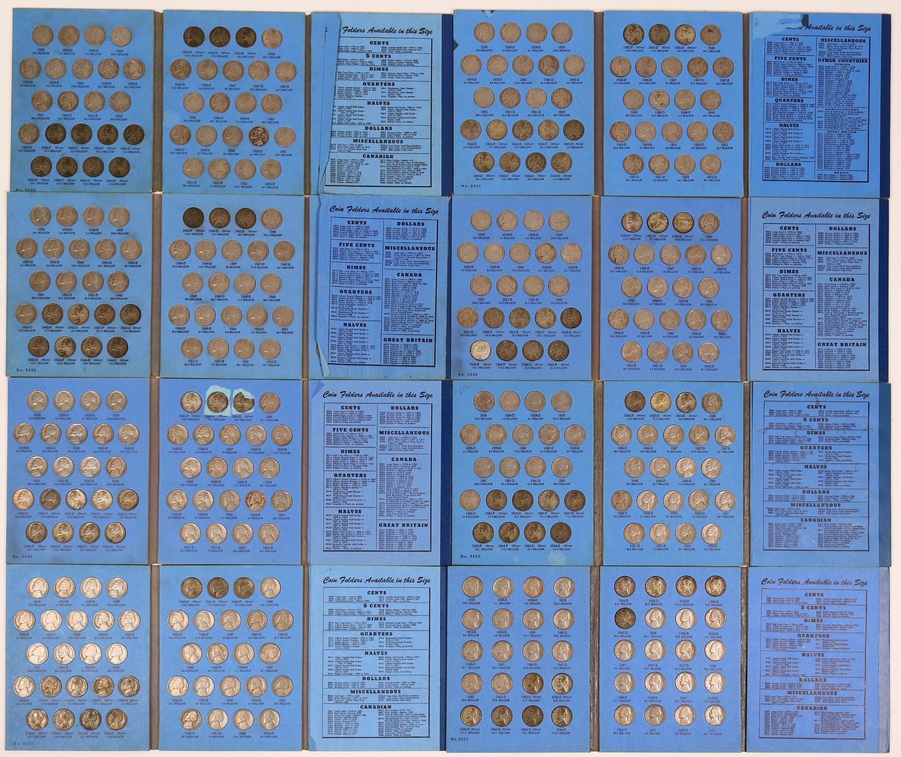 Eight FULL Whitman #9009 blue Jefferson Nickel albums: 1938-1961. Nickels are EF-BU condition.