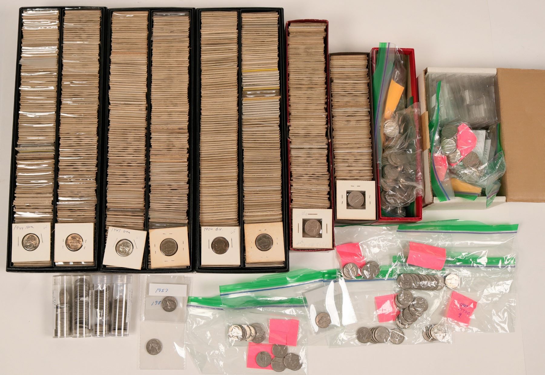 Over a thousand Jefferson Nickels, in 2 x 2s and graded. Three 12 inch long, double row boxes. Two single wide 10 inch boxes. A carton of BUs in ziplock bags by date and mintmark. Four partial rolls of BU dates. Many war nickels and 8 1950-Ds, including BU.