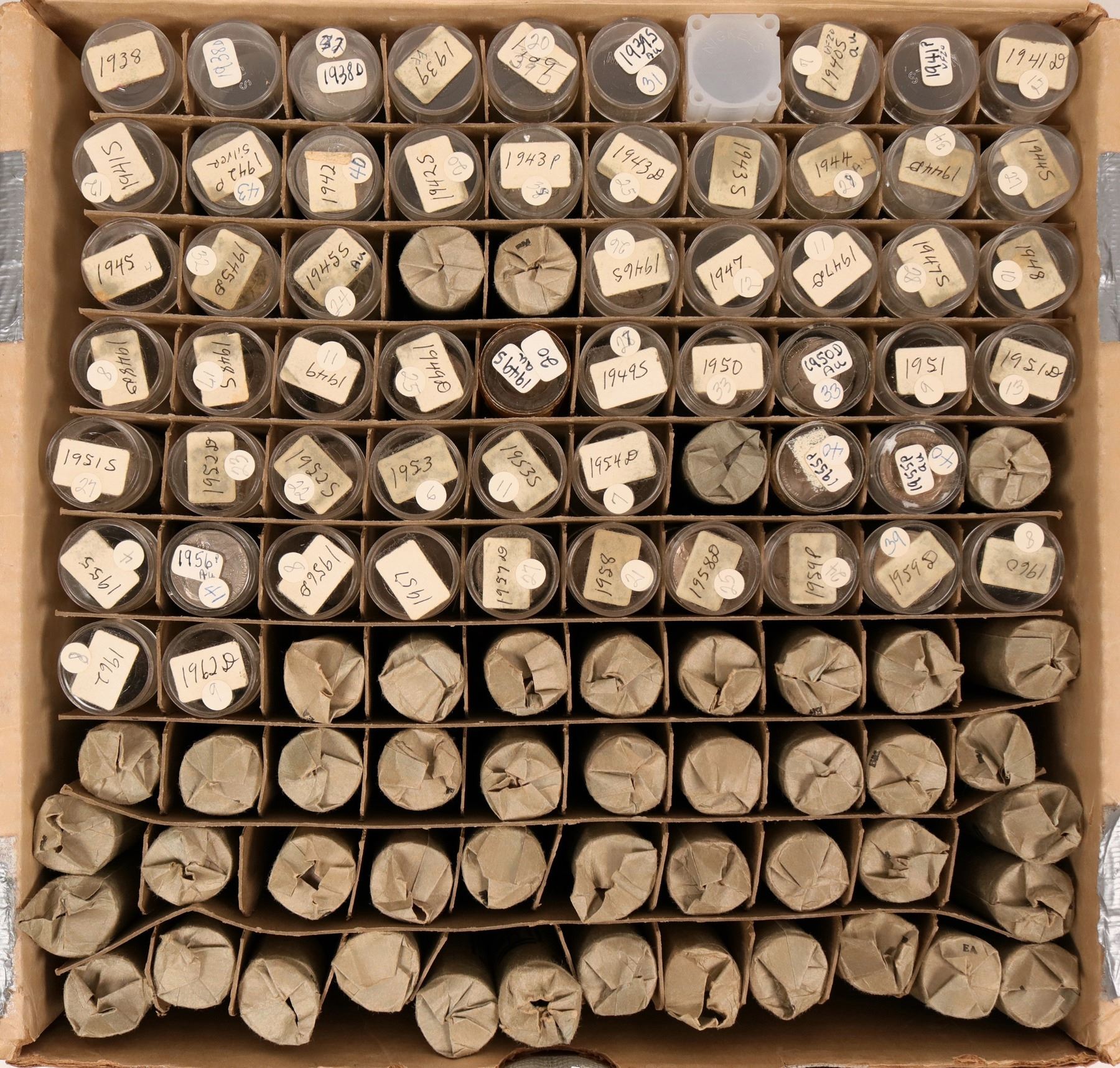 Box of one hundred rolls of Jefferson Nickels. Partial rolls of every date and mintmark 1938-1961. The 1950-D roll has 33 coins. Also 40 complete rolls of various dates.