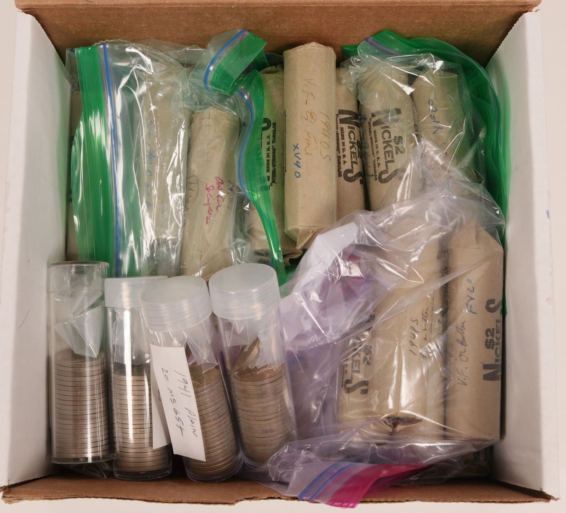 Box of 26 rolls: 1940-S, (4); 1941-S (1); 1945, (3); 1945-D, (1); 1945-S, (1); 1946-S, (2); 1947-S, (3); 1948-S, (2); 1949-S, (9). Also four half rolls (20 coins) of BU nickels: 1940-D, 1941, 1941-S, and 1948-S. There are five rolls of 35% silver nickels in this lot.
