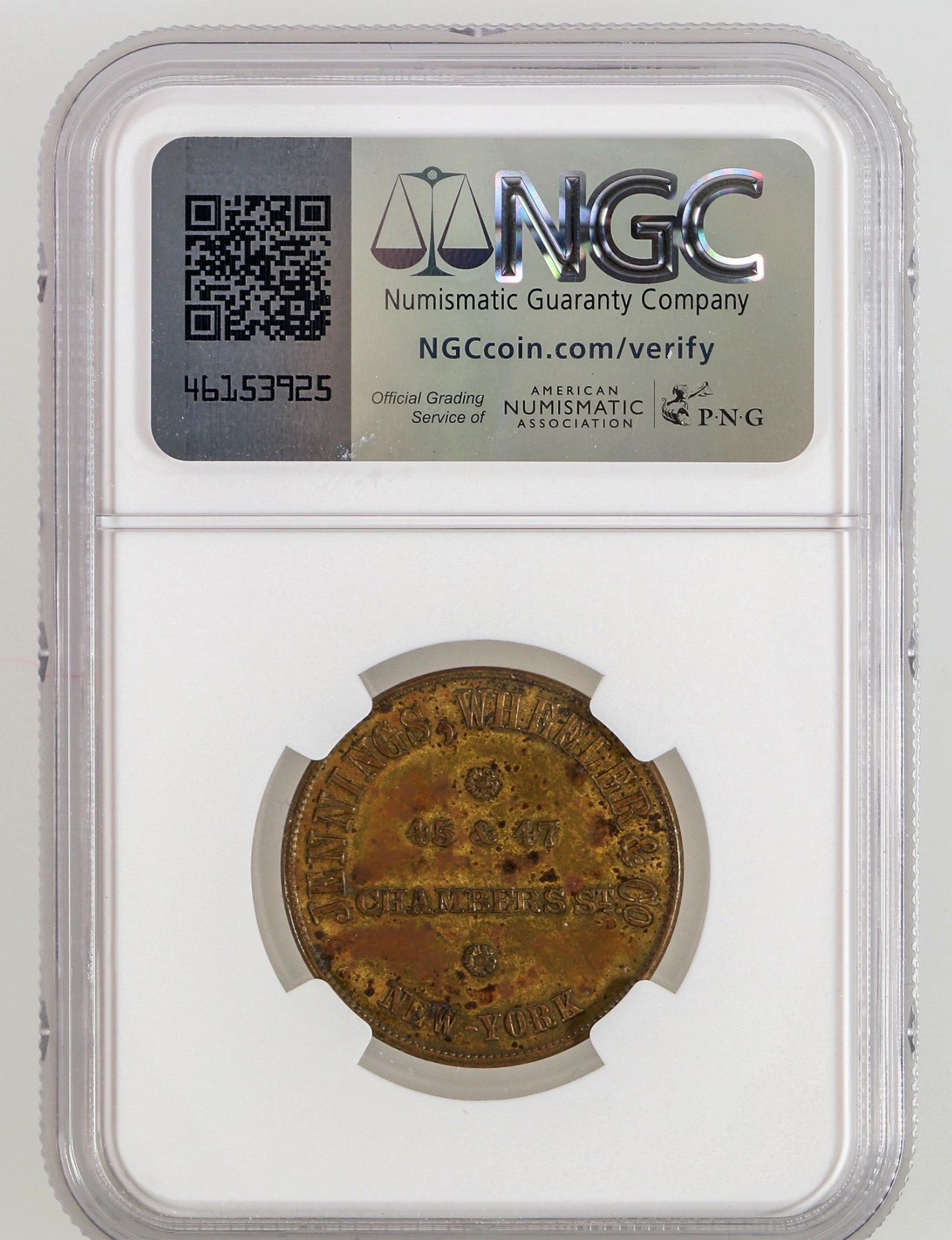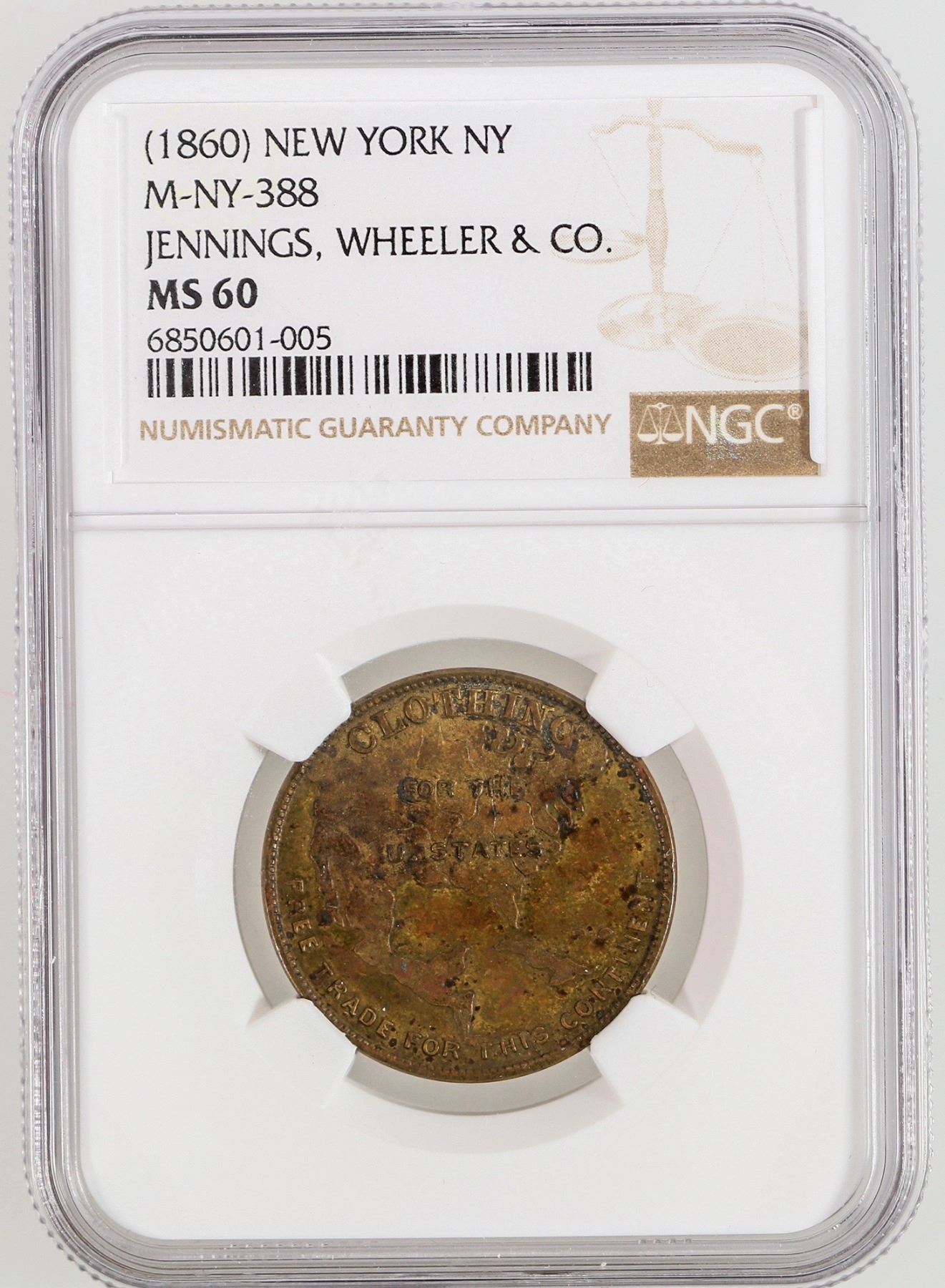 NGC graded MS 60. Map obverse: Clothing / For The / U. States / Free Trade For This Continent; Rev.: Jennings, Wheeler & Co. / 45 & 47 / Chambers St. / New York; Br., rd., 28 mm.