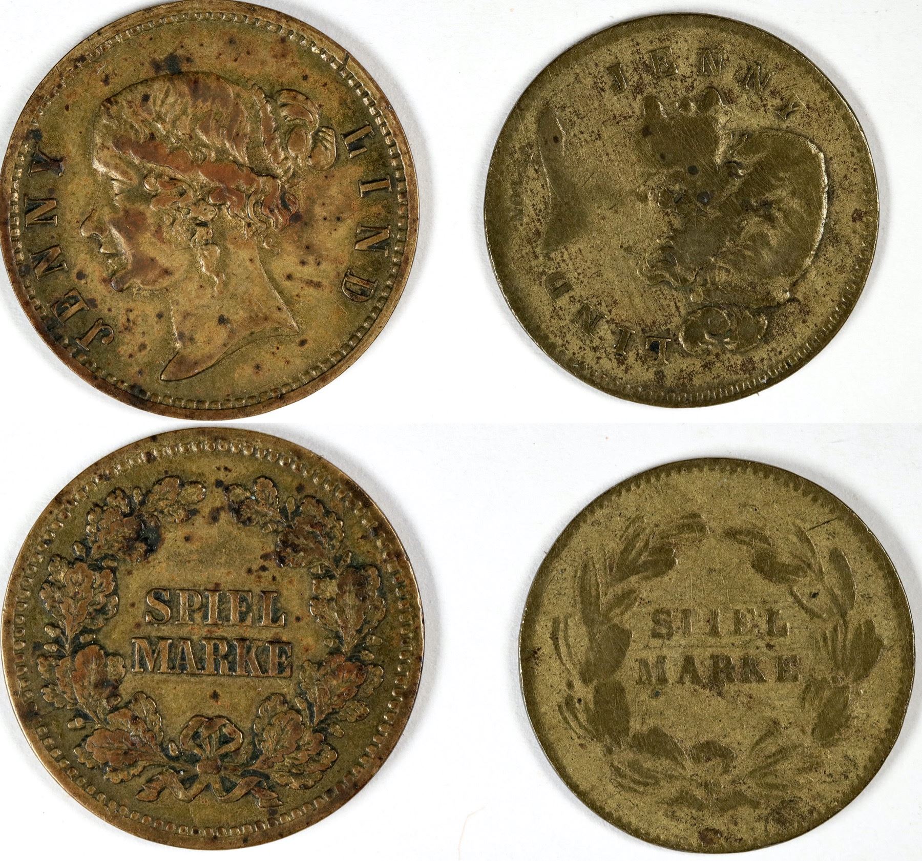 Two Jenny Lind (See story) Spiel Marke counters. One is in a denomination of $2.50 (.50"), the other $5 (.75"). Although they are from two different die makers (4950/5965), they share the same catalog number in The American Counter Catalog. Both are in good condition. Both appear to be made of brass. See photos for more details.