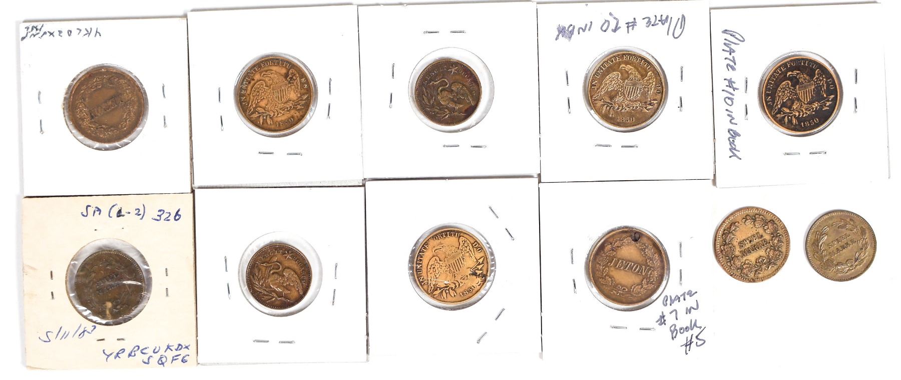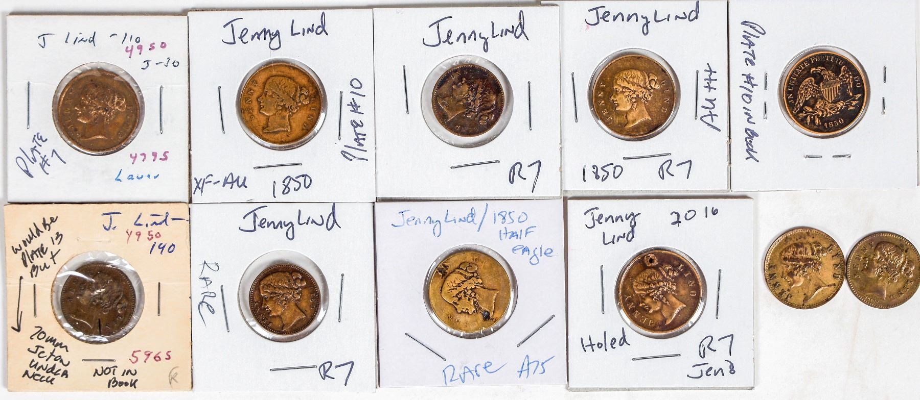 The "Swedish Nightingale" soprano Jenny Lind was a world wide super star in the middle of the 19th century. This lot of twelve jetons, or spiel markes, or gaming tokens, feature her on the obverse. Some reverses have the eagle reverse like U. S. gold coins; or the word Jeton; or Spiel Marke. All are brass and about 20 mm.