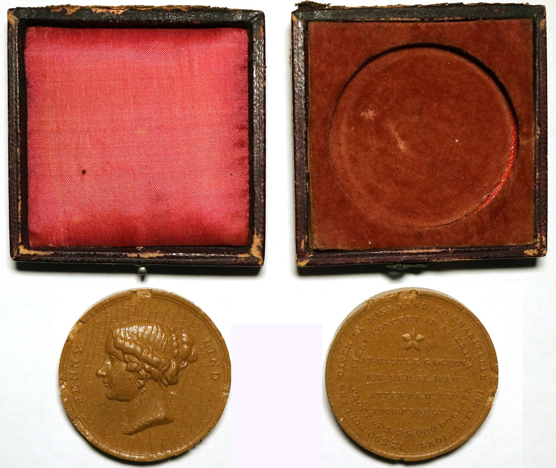 In original box (top has become unattached), this 41 mm wooden piece has an obverse portrait of Jenny Lind and a reverse that reads: "12,500 dollars given by Miss Lind to charitable institutions / First concert in America / At Castle Garden / N. Y. Sep. 11, 1850 / Attended By / 7000 People / Proceeds 35,000 Dollars." Johanna Maria "Jenny" Lind (1820 – 1887) was a Swedish opera singer, often called the "Swedish Nightingale". One of the most highly regarded singers of the 19th century, she performed in soprano roles in opera in Sweden and across Europe, and undertook an extraordinarily popular concert tour of the United States beginning in 1850 at the invitation of P.T. Barnum. She gave 93 concerts for him. She earned more than $350,000 from these concerts, donating the proceeds to charities, principally the endowment of free schools in Sweden. With her new husband, Otto Goldschmidt, she returned to Europe in 1852 where she had three children and gave occasional concerts over the next two decades, settling in England in 1855. From 1882, for some years, she was a professor of singing at the Royal College of Music in London.