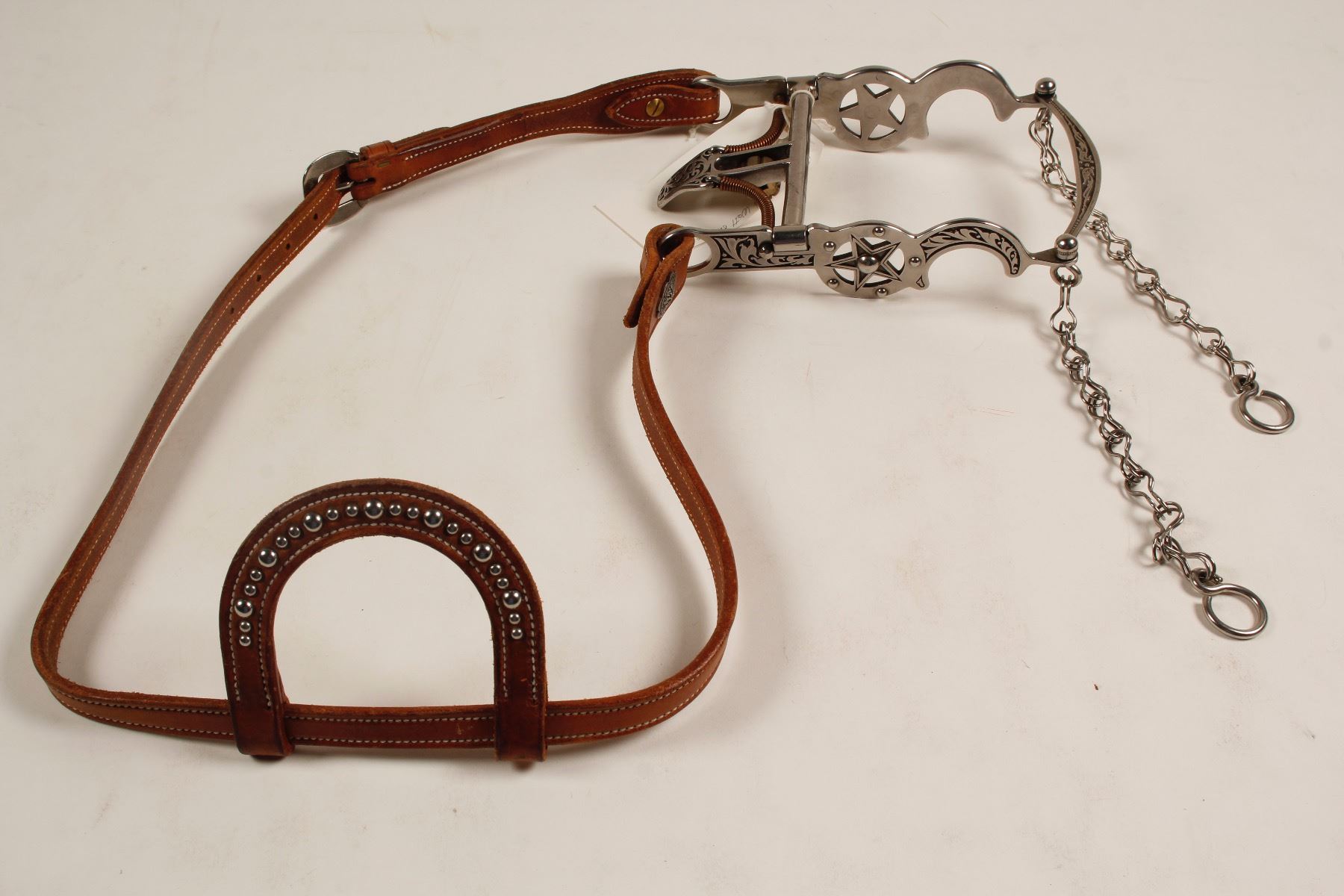 Jeremiah Watt made stainless engraved spade bit on a nice leather headstall with trim pieces by Jeremiah. Bit has a 5 point star on the cheek and the top of the spade is also engraved. Mouth is 5” and from the top of the bridle rings to the lip bar measures 8”. Accompanied by a nice set of rein chains.