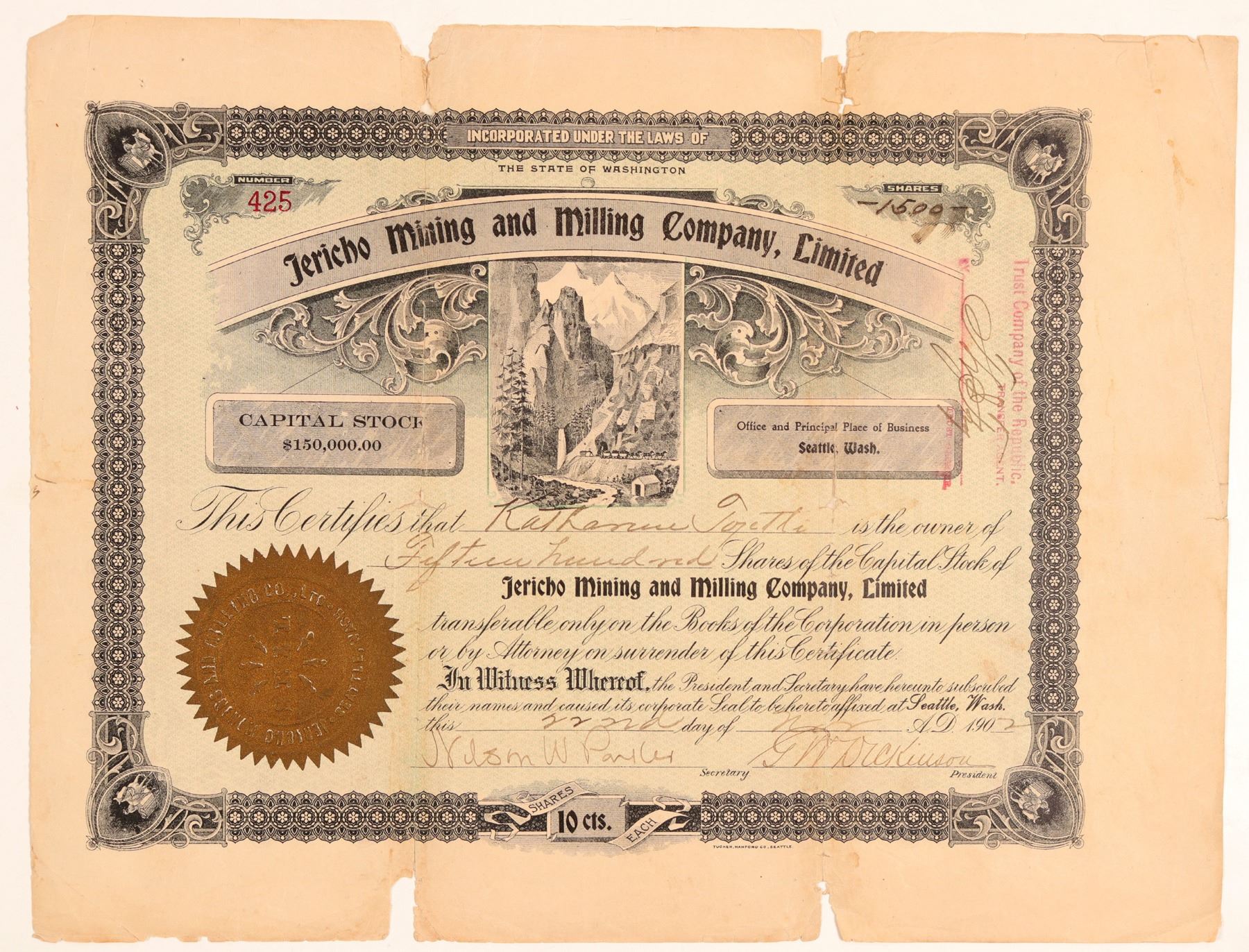 # 425 for 1500 shares to Katherine (?). Singed by Parker and president Dickinson. Dateline 1902. Not cancelled. Fabulous vignette of horse drawn three ore cart train meandering in a steep canyon. Printer Tucker, Hanford of Seattle. We Poor condition (see photo online), but RARE! Ken Prag Collection