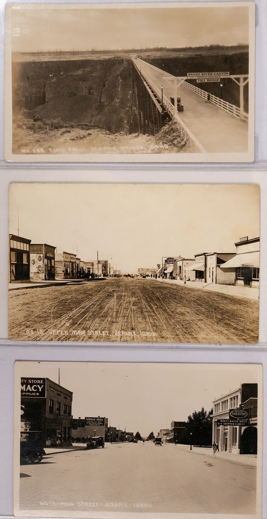 No. 14 Main Street, Jerome Idaho show the theater, and several store fronts. No 15, Upper Main Street, Jerome, Idaho with a one cent stamp; Jerome bridge.