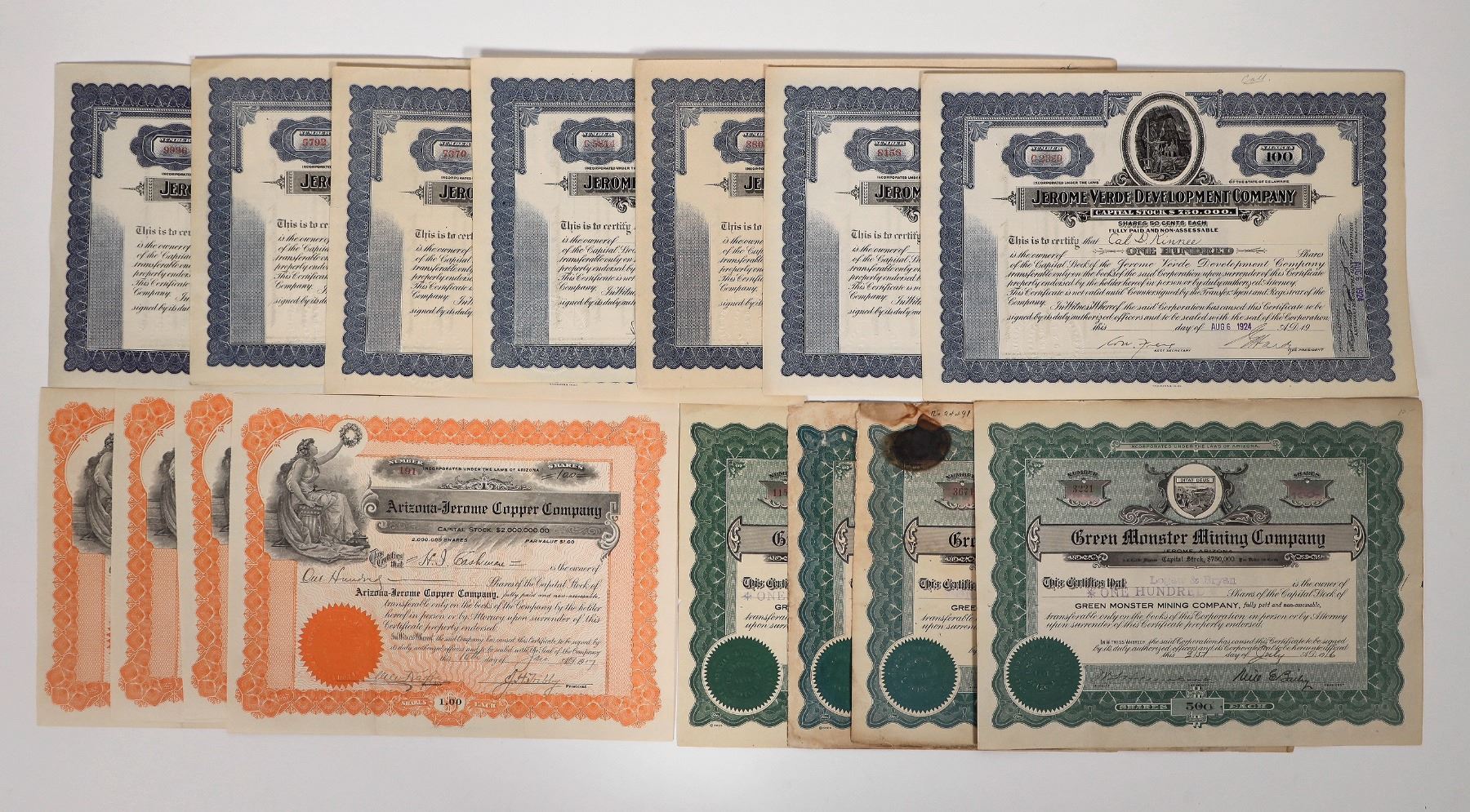 Issued-7x 1921-42 Jerome Verde Dev., 4x 1917 Arizona-Jerome Copper, 4x 1916 Green Monster Mining-2 are soiled.