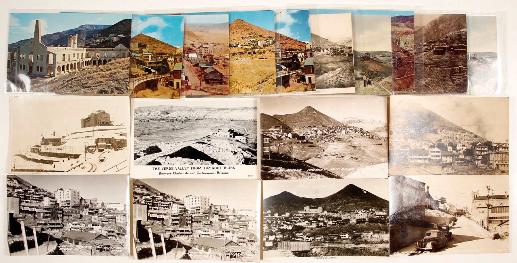 Lot of 20 mixed real photo, color illustrations and color photo postcards. 8 are PRCs, and the photographers and producers are identified as L.L. Cook, Lollesgard Specialty Co., and Frashers Foto. The rest of the postcards are all either color illustrations or color photo postcards. Only 1 of the postcards has a postmarked from 1931. Date: Location: Jerome, Arizona HWAC# 63820