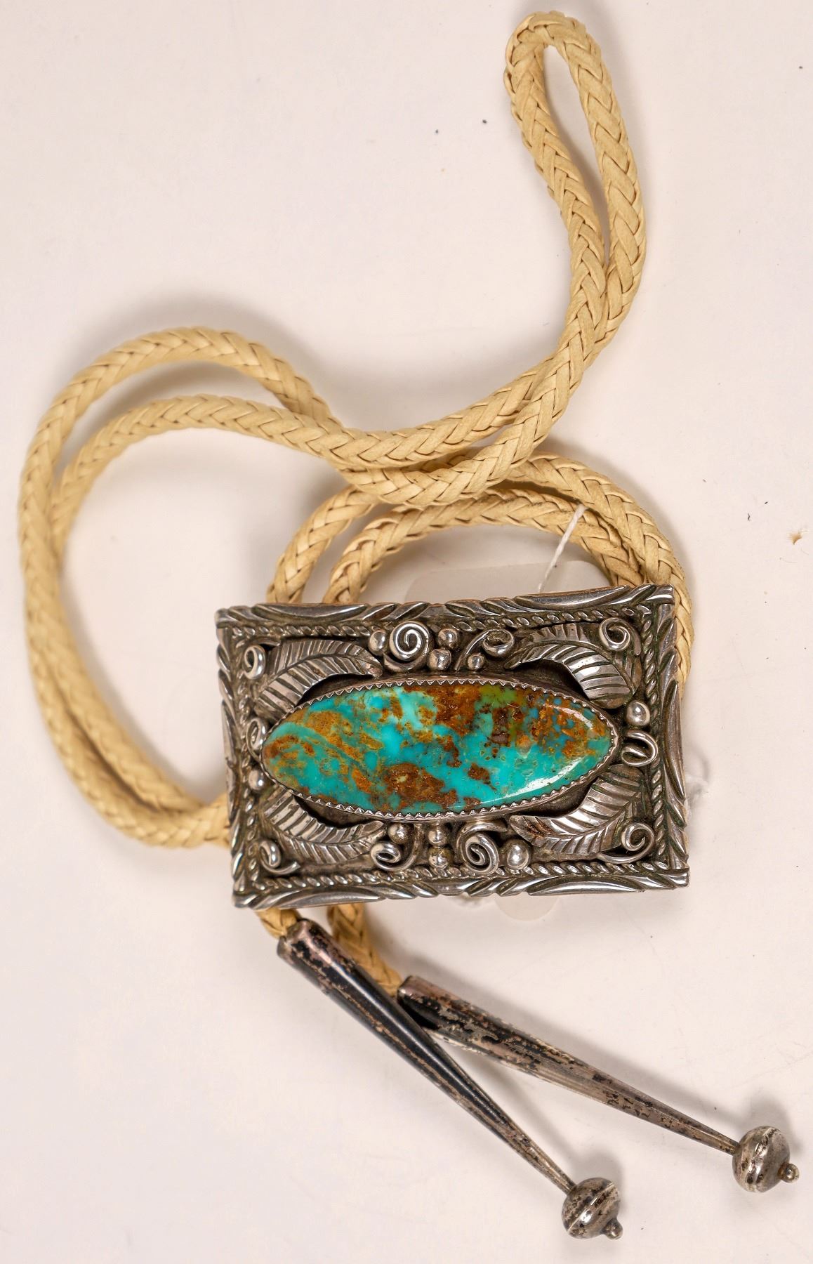 Rectangular silver bolo set with beautiful oval turquoise stone. Leaf design. Hallmarked "C" on reverse. ivory leather tie with silver tips. 2" long x 1.25" wide.