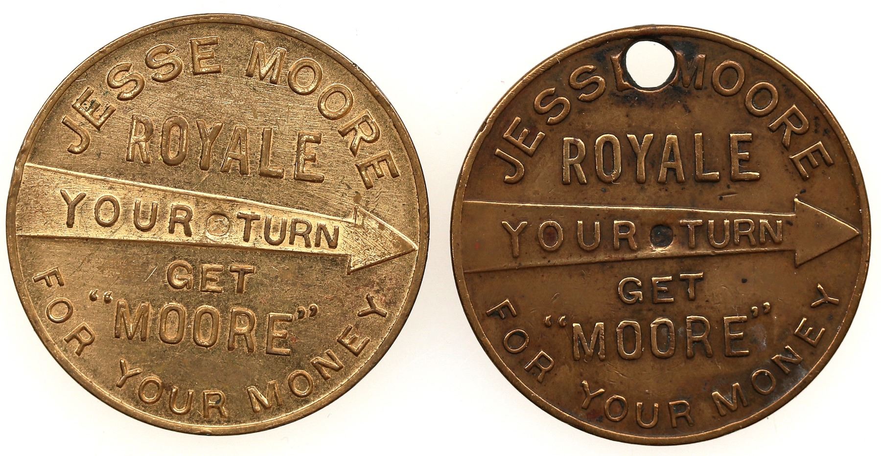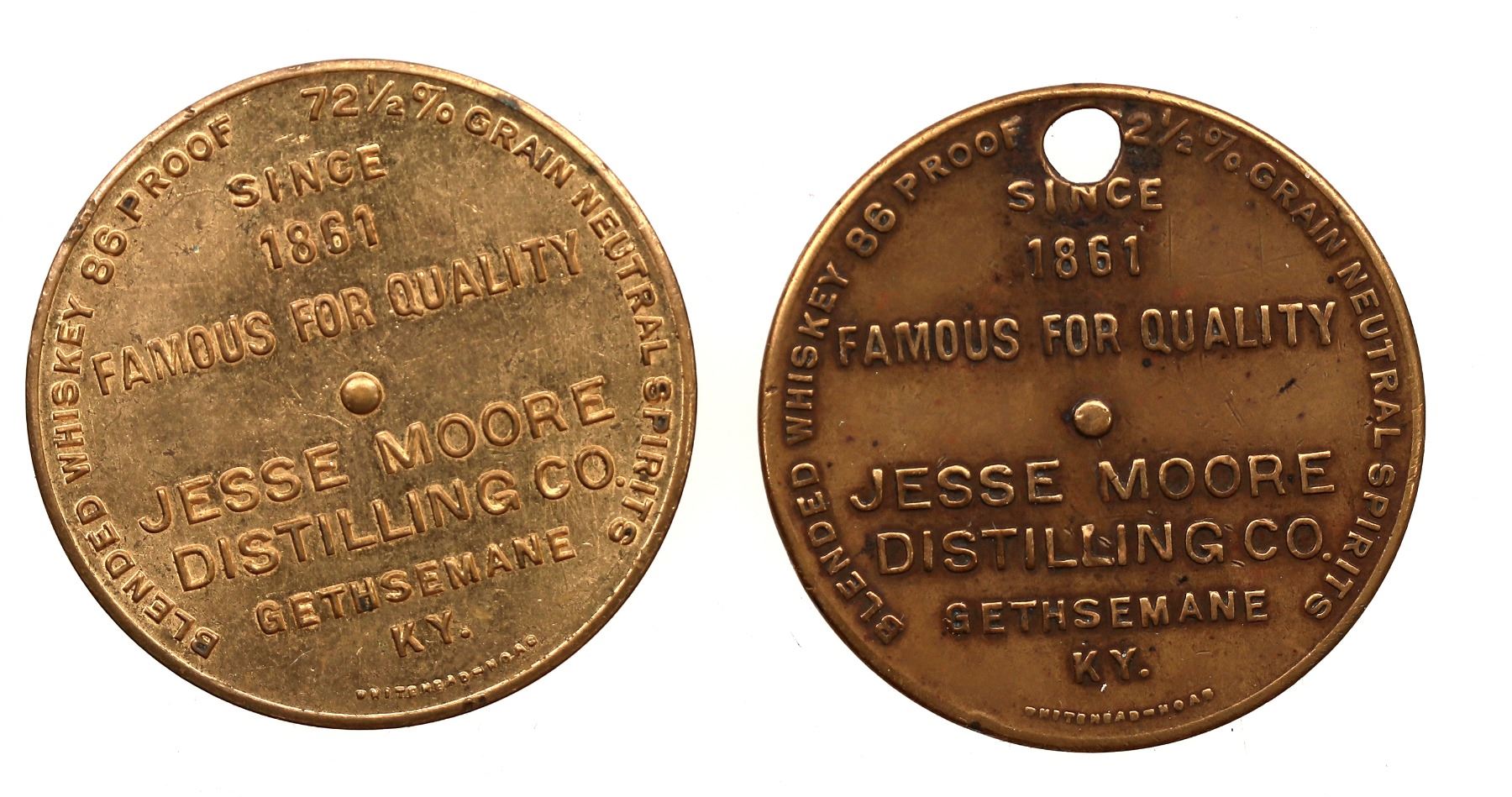 Lot of two rare Jesse Moore Whiskey tokens. Obv.: Since / 1861 / Famous For Quality /Jesse Moore / Distilling Co. / Gethsemane / Ky. / Blended Whiskey 86 Proof 72 1/2% grain neutral spirits Rev.: Jesse Moore / Royale / Your Turn / Get / "Moore" / For Your Money. Br., rd., 32 mm. One is holed. Spinner for deciding who's buying.