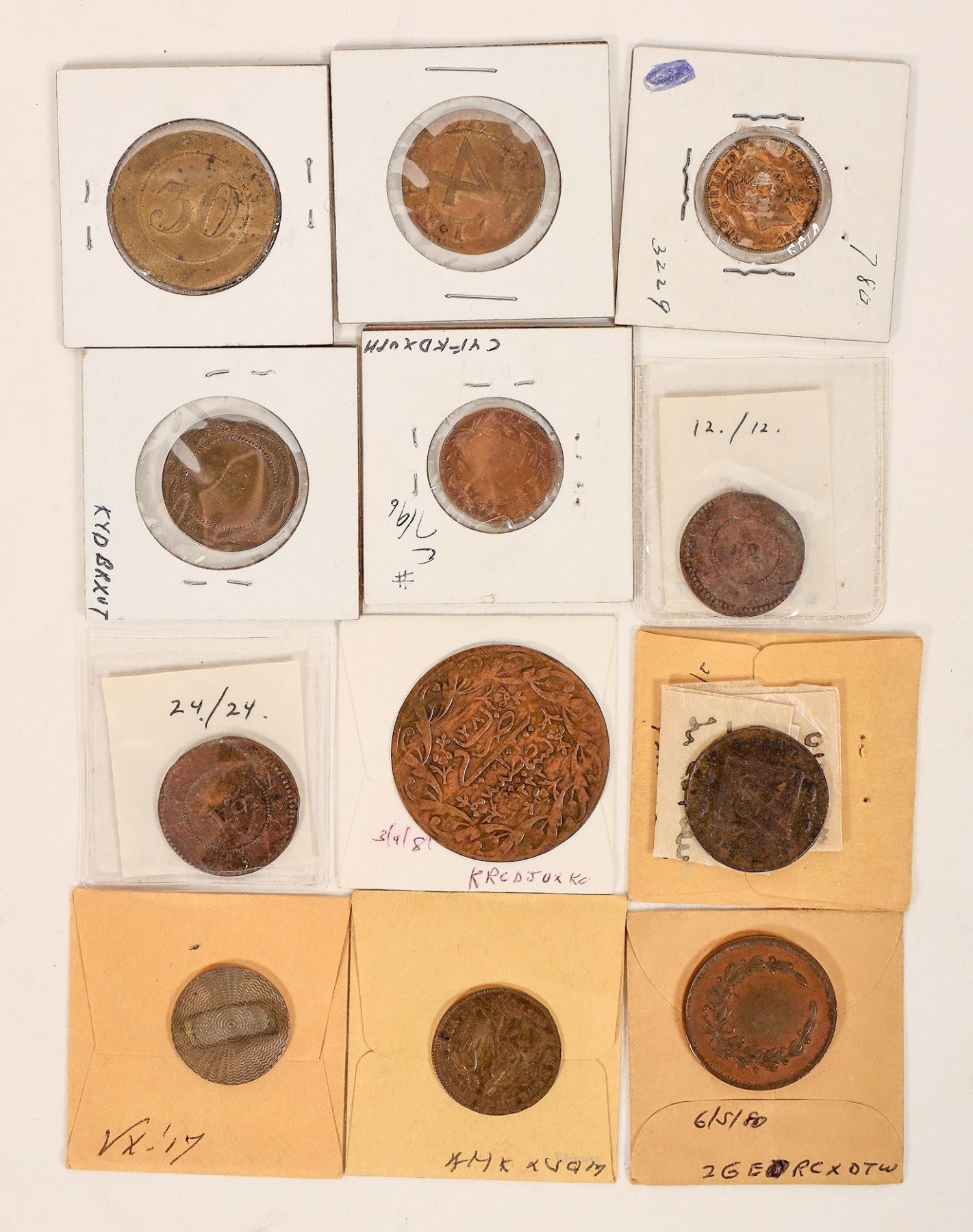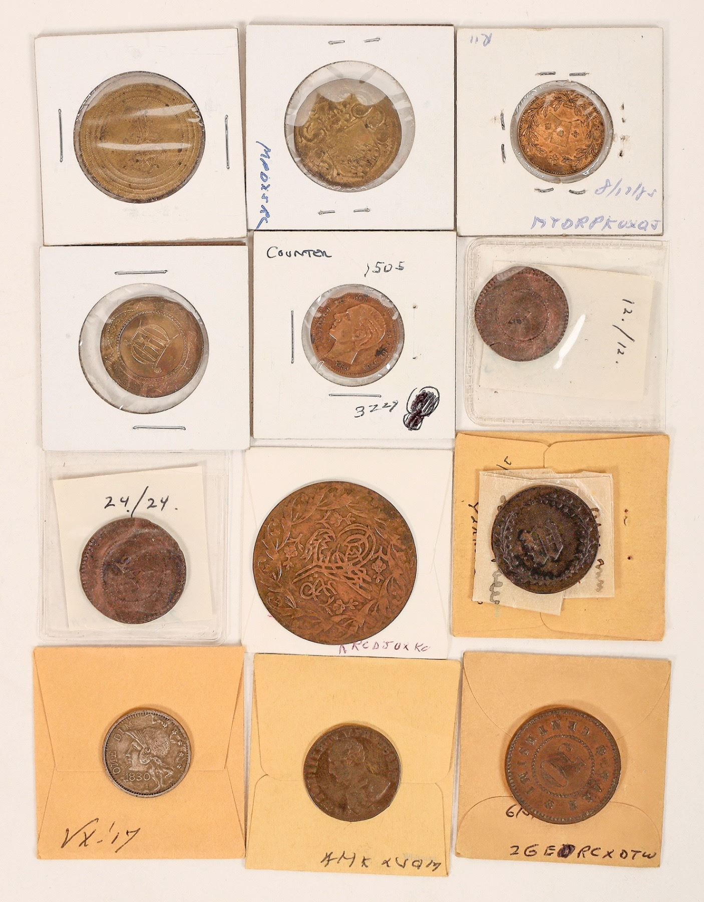 Lot of twelve medals used for gaming counters. All different, various denominations and sizes. [ Foreign
