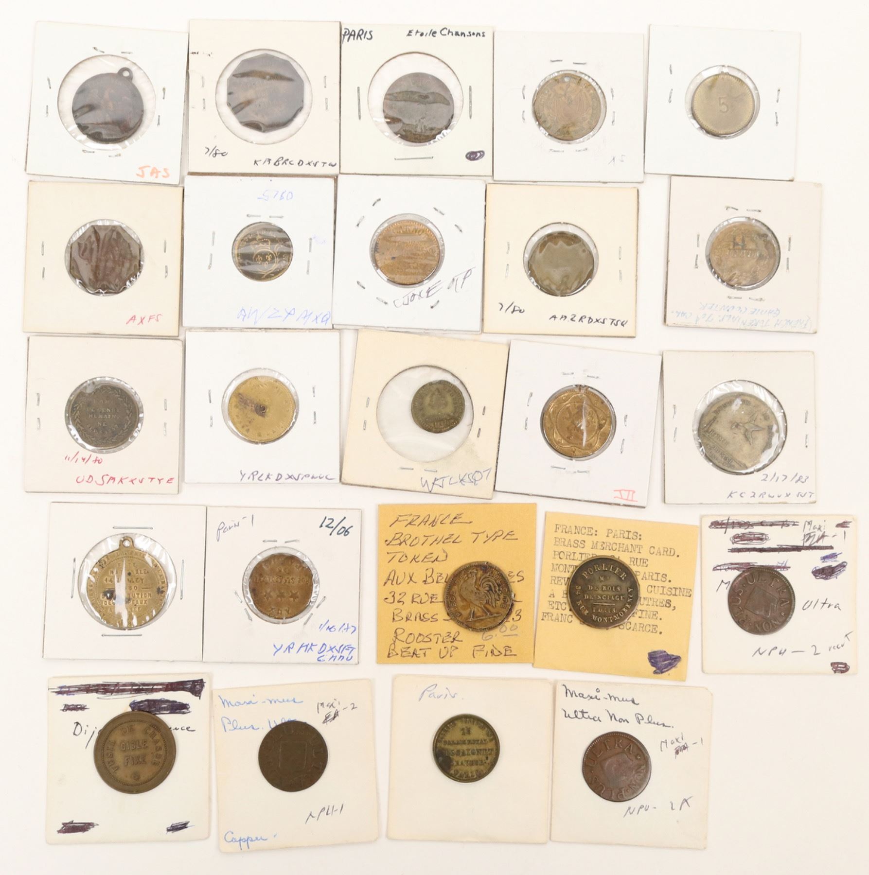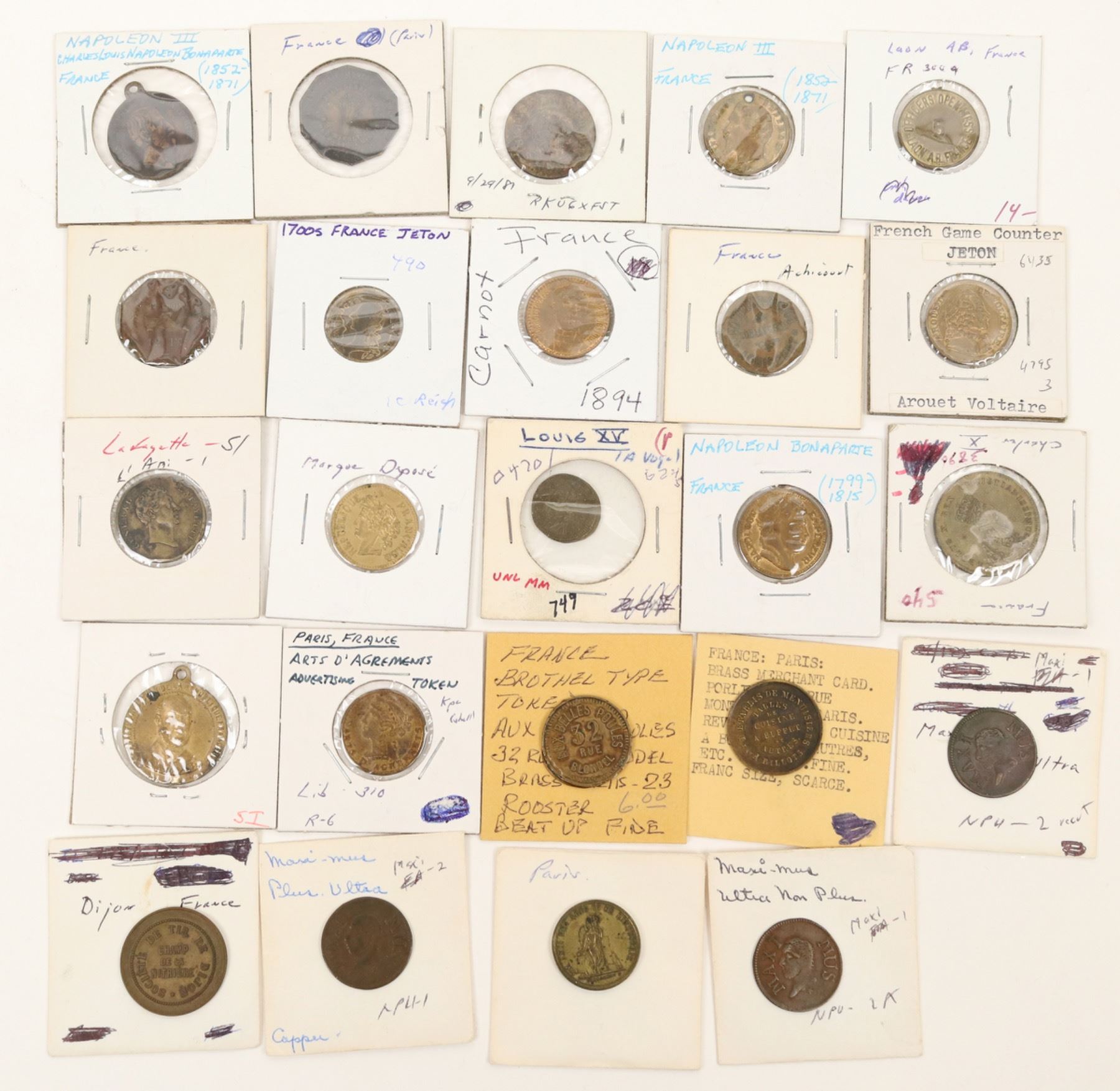 Lot of 25 tokens and jetons of France. Napoleon Bonaparte; Louis XV; Aux Belles Pooles, 32 Rue Blondel; Arouet Voltaire; Laon Air Base Officers Open Mess; Etoile Chansons and many more. [ France