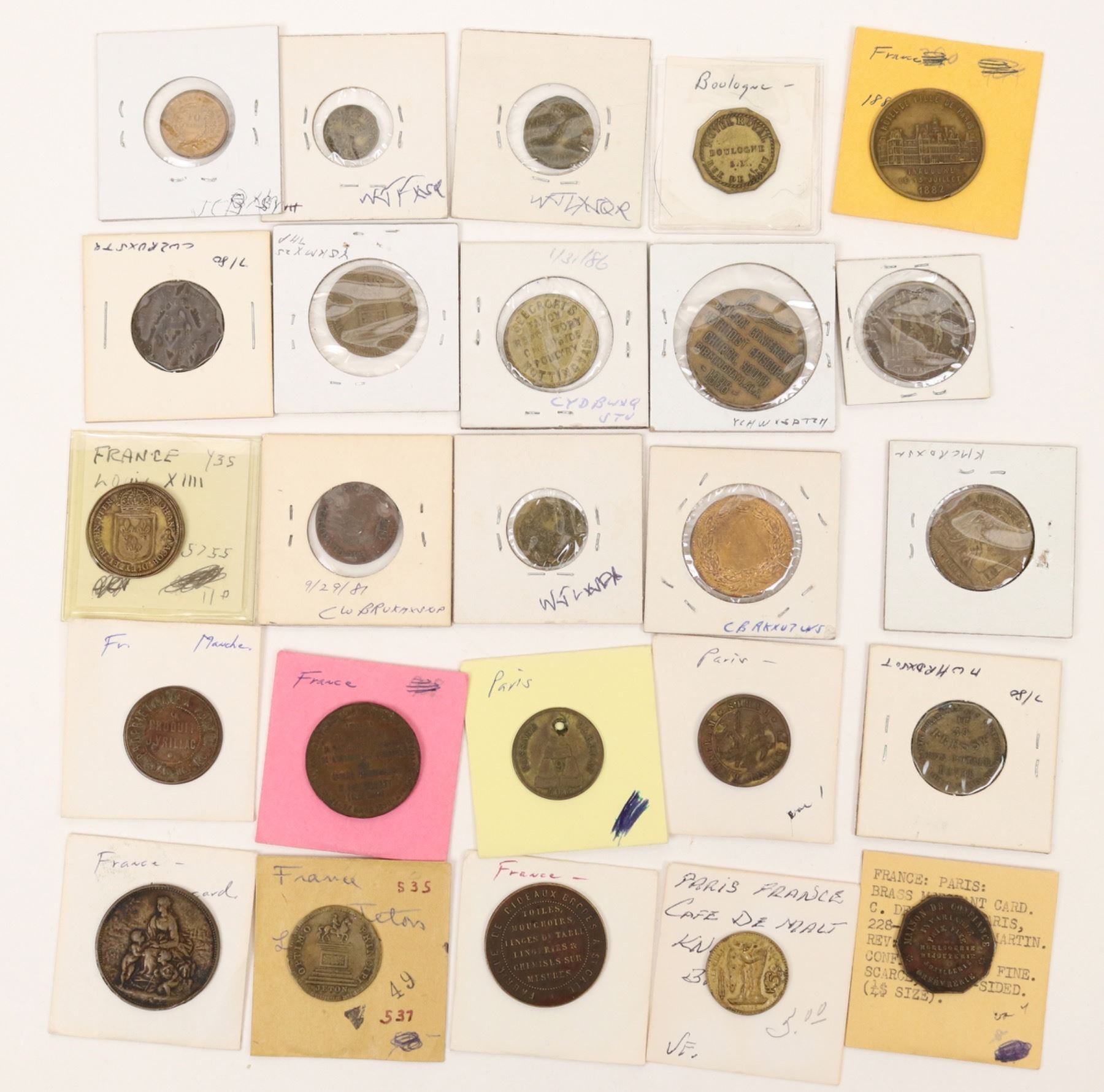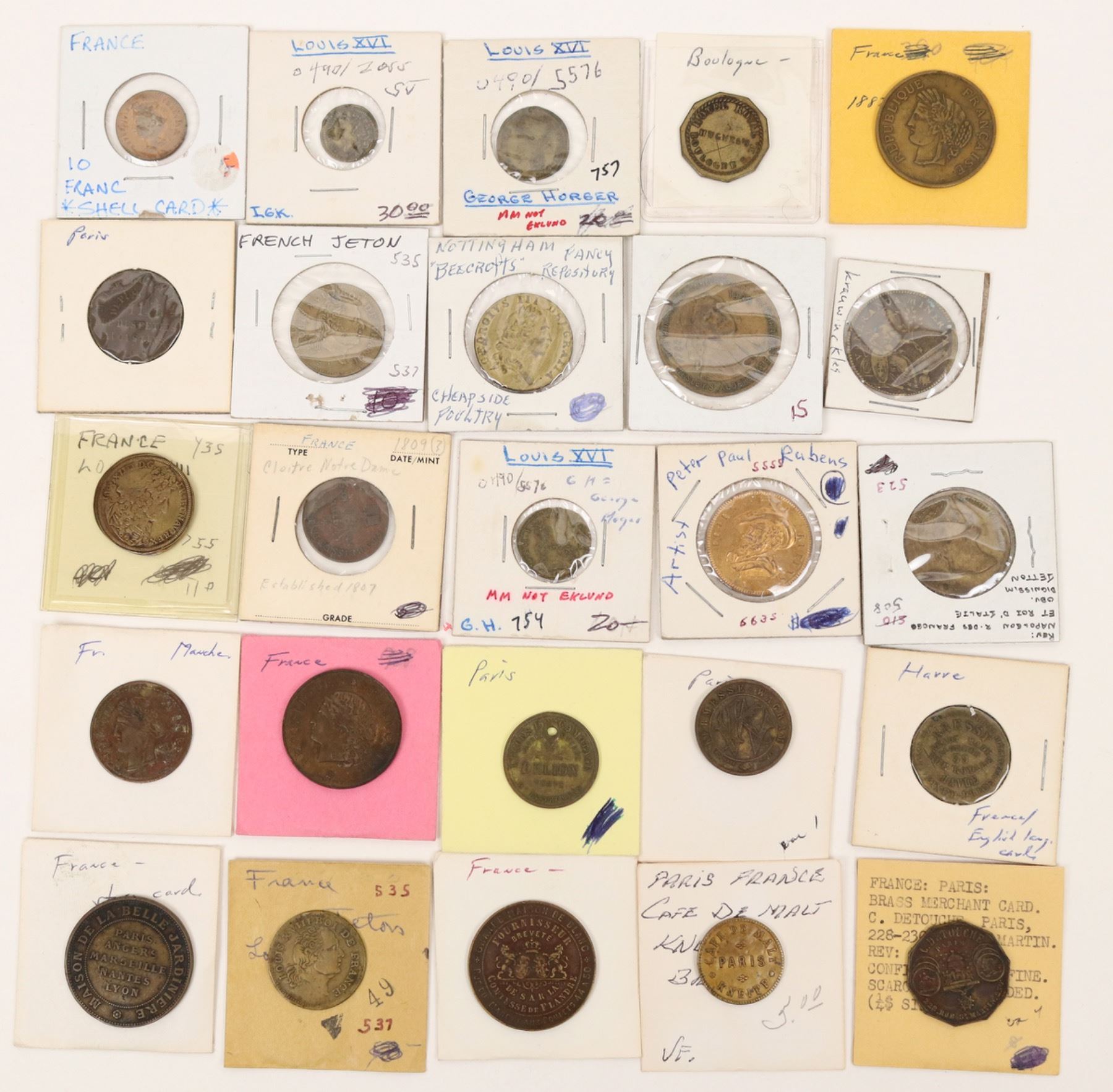 Lot of 25 jetons and merchant tokens from France: Peter Paul Rubens; Louis XVI; Paris merchant token: C. Detouche, Rue St. Martin; 10 franc shell card; Hotel Royal, Boulogne; 1882 Hotel Dee Ville de Paris and many more. [ France