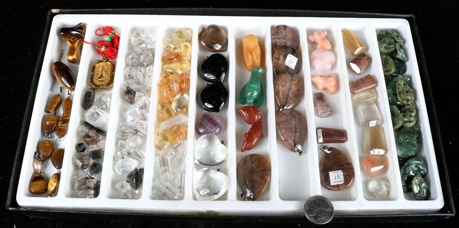 Mostly small 1/2" o 1.5" pieces includes carved pendants and stone animals. Includes also tigers eye, quartz, citrine, smokey quartz, chiastolite, rose quartz, rutilated quartz, possible jade. More than China Chunlin Zhu Collection