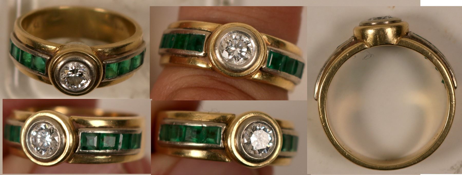 Very beautiful , diamond, emerald, and gold ladies ring. It is stamped 750KT weight, yellow gold with a flat shank, and a bright polish finish. One bezel set round brilliant cut diamond ( depth est ), approximate total weight of 0.35ct. Clarity: VS-2, Color 1, and Cut: Good. Eight princess cut natural emeralds, measuring 2.80x 2.80 x2.30mm, (depth estimated) total weight of 0.96ct. Total weight of ring is 7.10gm. Replacement value...$3,795.00. Appraisal document available upon request. Very nice item. ( RH )
